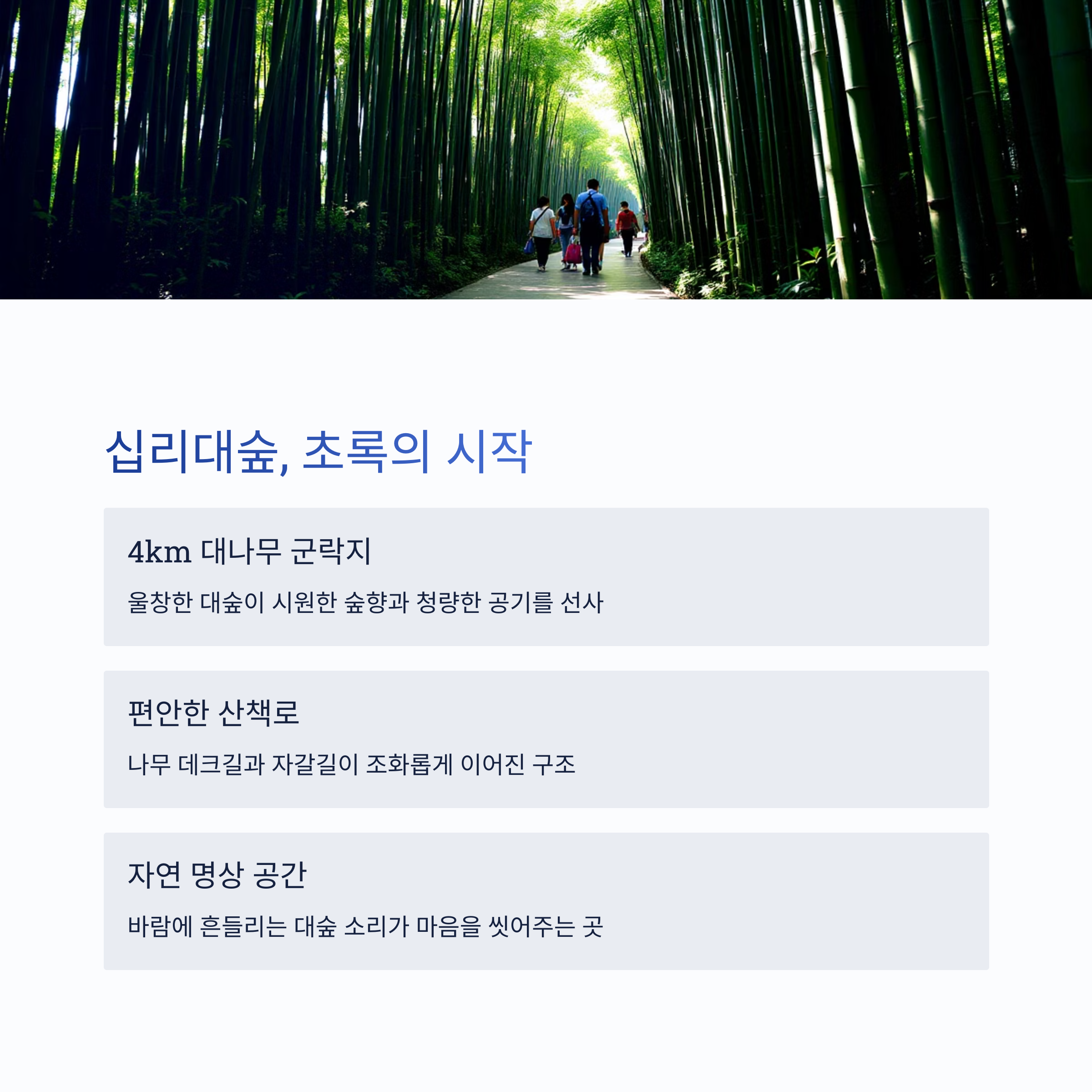 | 십리대숲 | 약 4km | 대나무 숲, 데크길 |