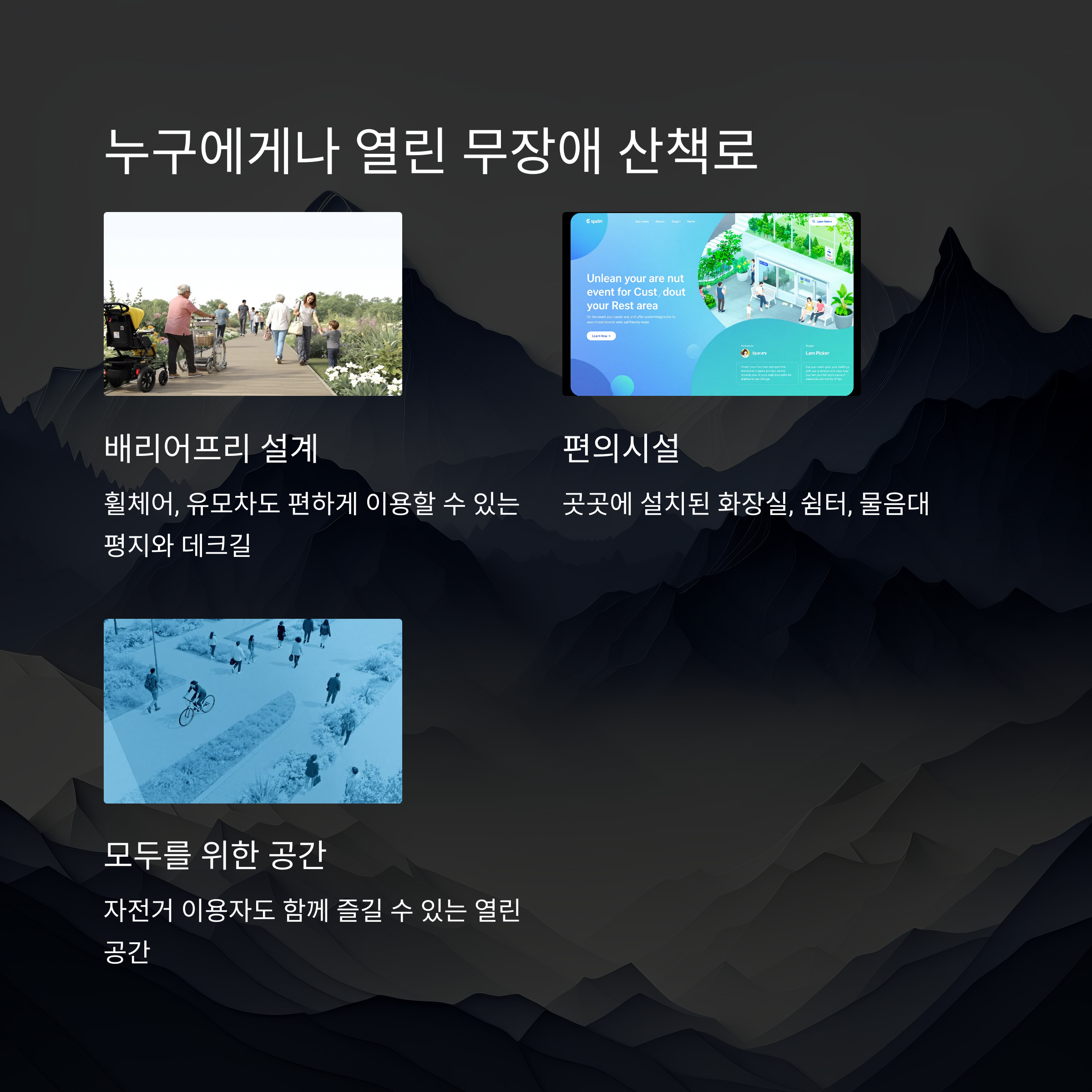 휠체어, 유모차, 자전거 이용자까지 모두가 편하게 산책할 수 있으며