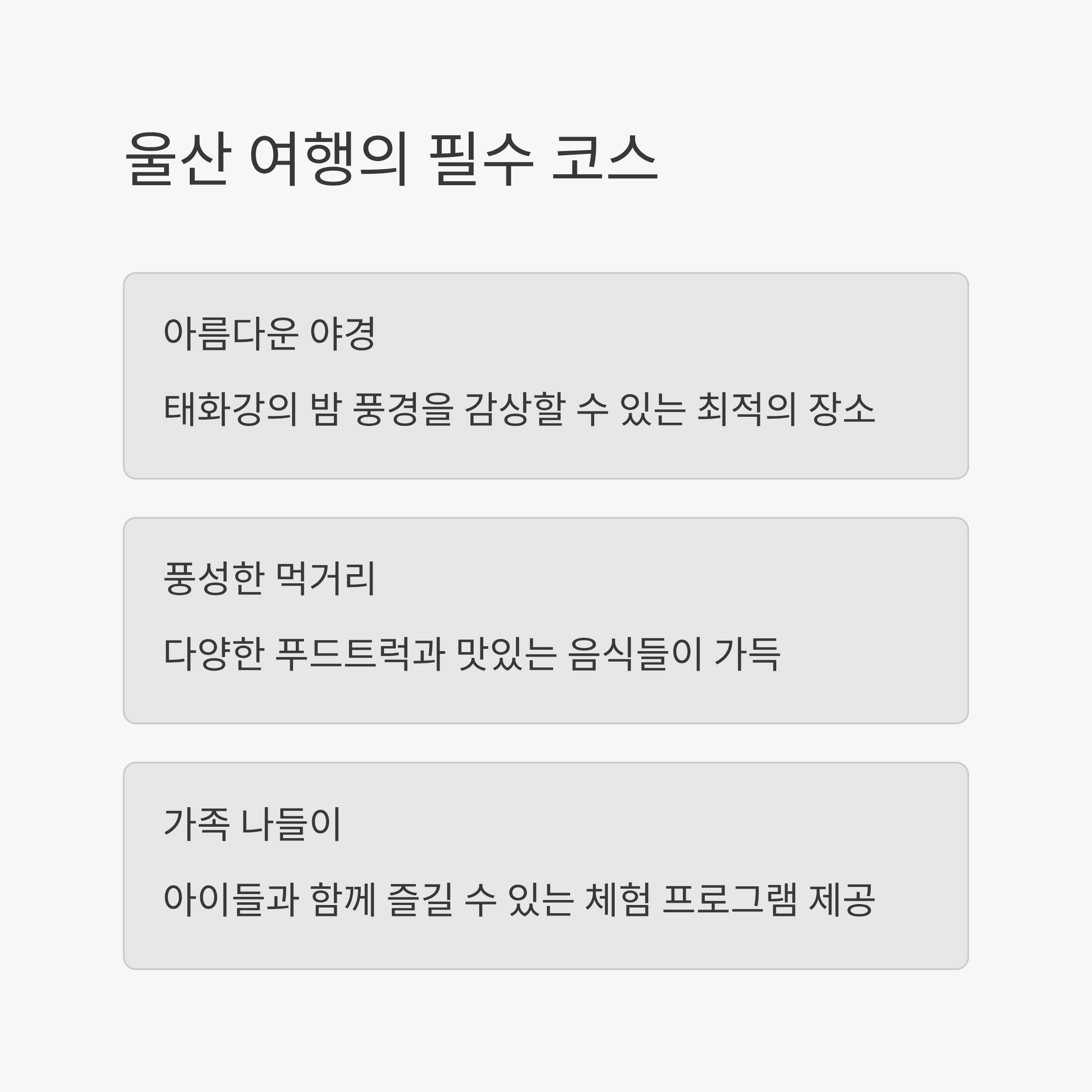 - 교통: 자차+공영주차장 또는 대중교통(울산역 버스 연계)