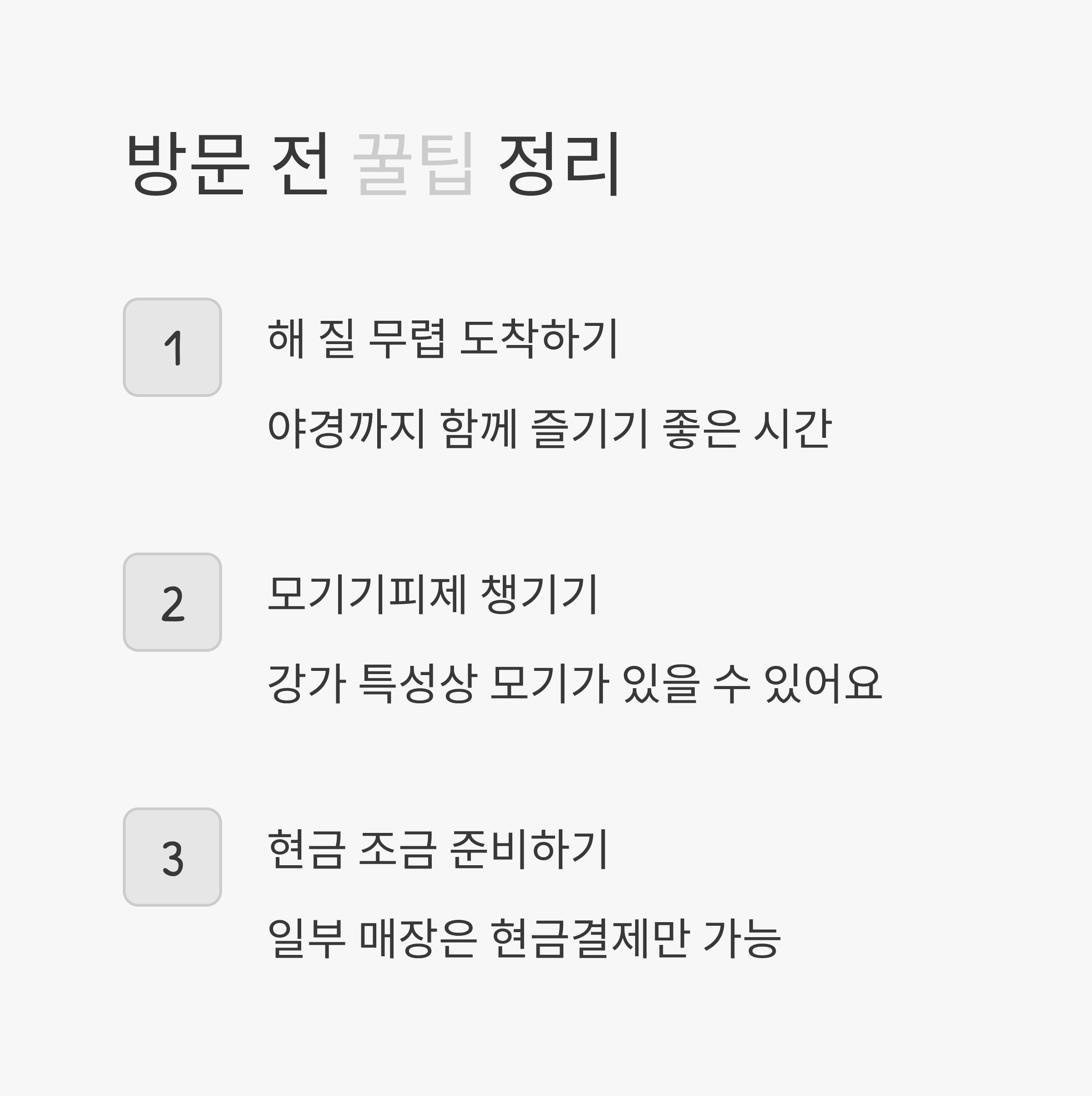 - 추천 시간대: 해 질 무렵 도착해 야경까지 함께 즐기기