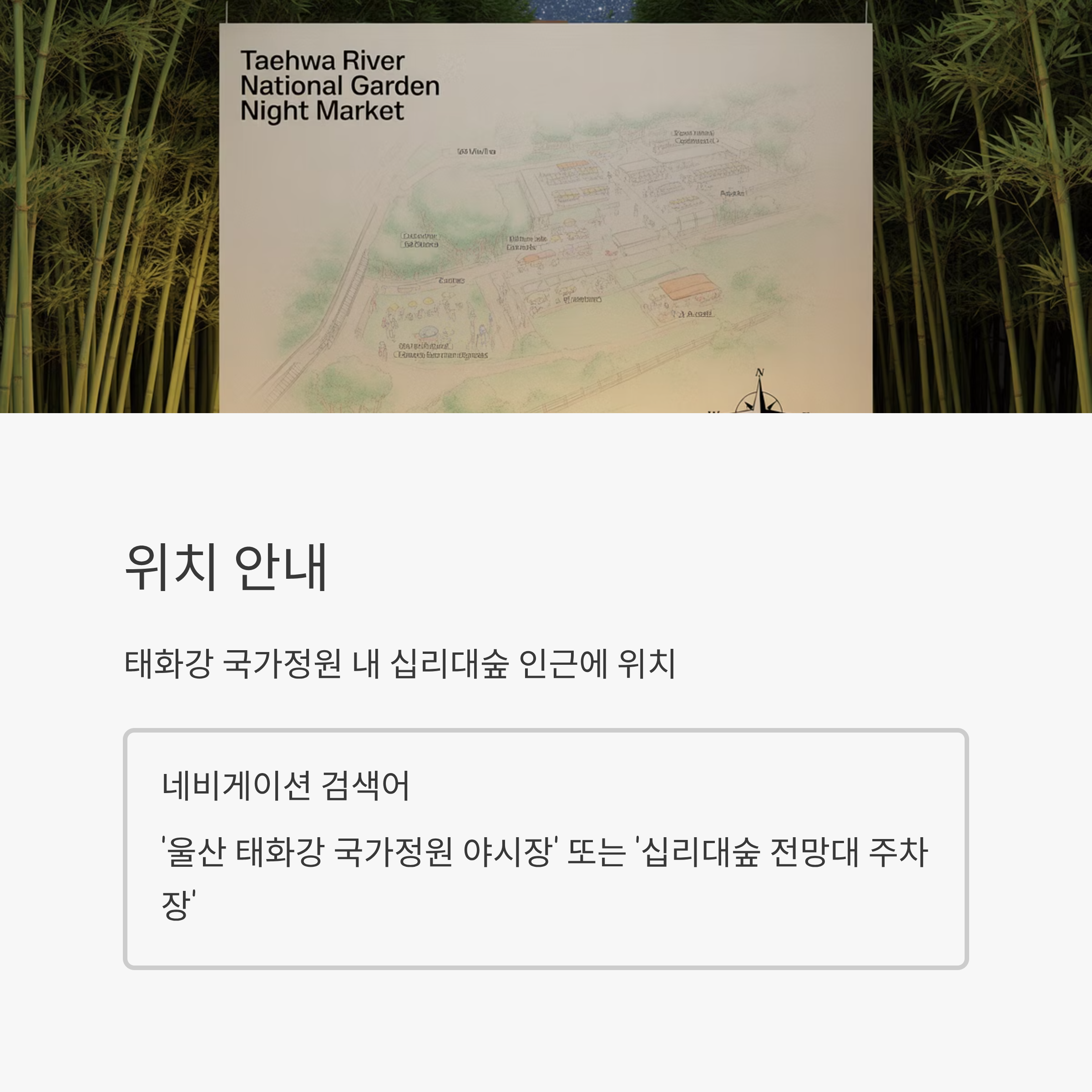 네비에 ‘울산 태화강 국가정원 야시장’ 또는 ‘십리대숲 전망대 주차장’을 검색하면 쉽게 찾아갈 수 있습니다.