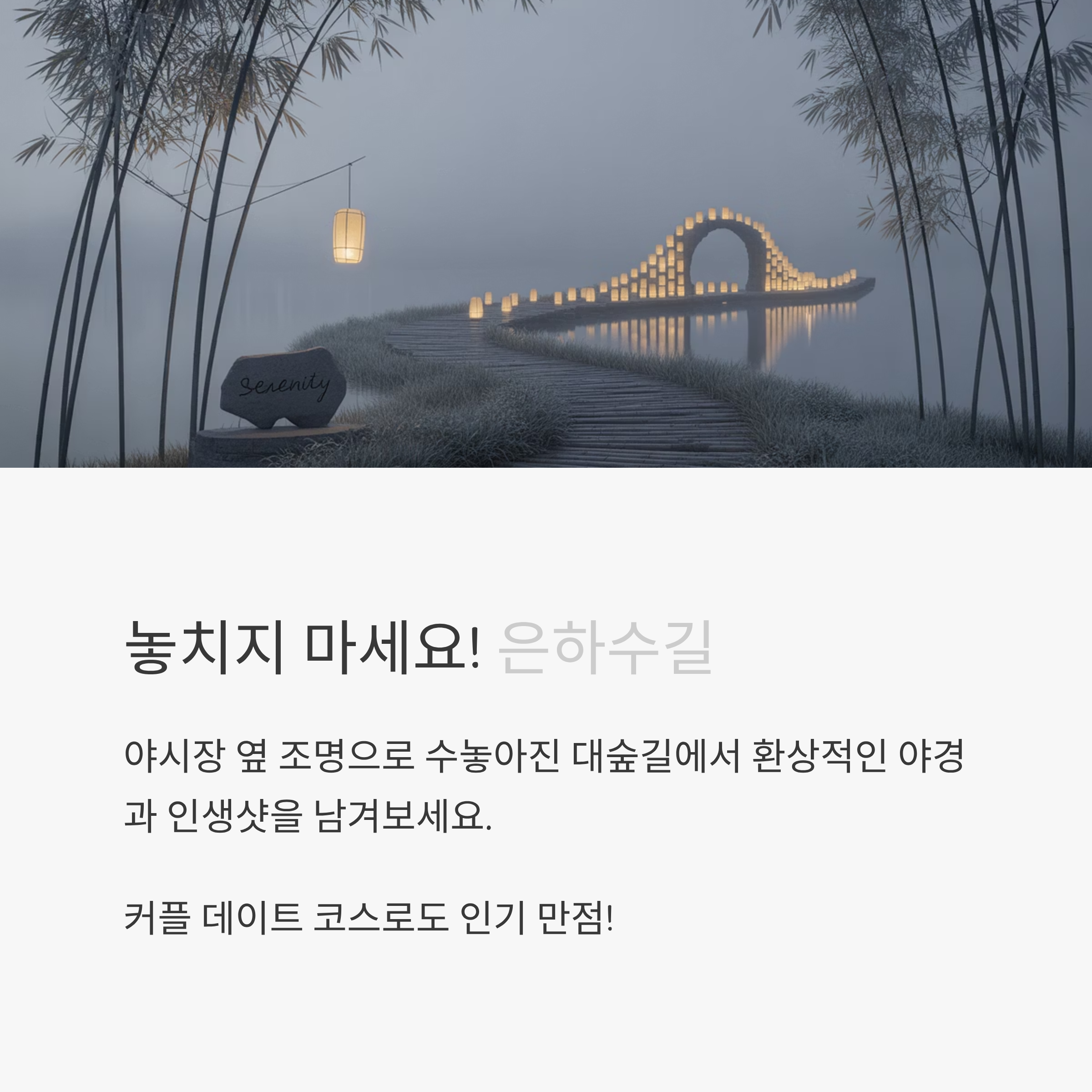 야시장을 다 둘러본 후에는 태화강의 명물 ‘은하수길’ 산책도 꼭 해보세요. 조명으로 수놓아진 대숲길은 낮과 전혀 다른 분위기를 선사하며 커플 데이트 코스로도 인기 만점입니다.
