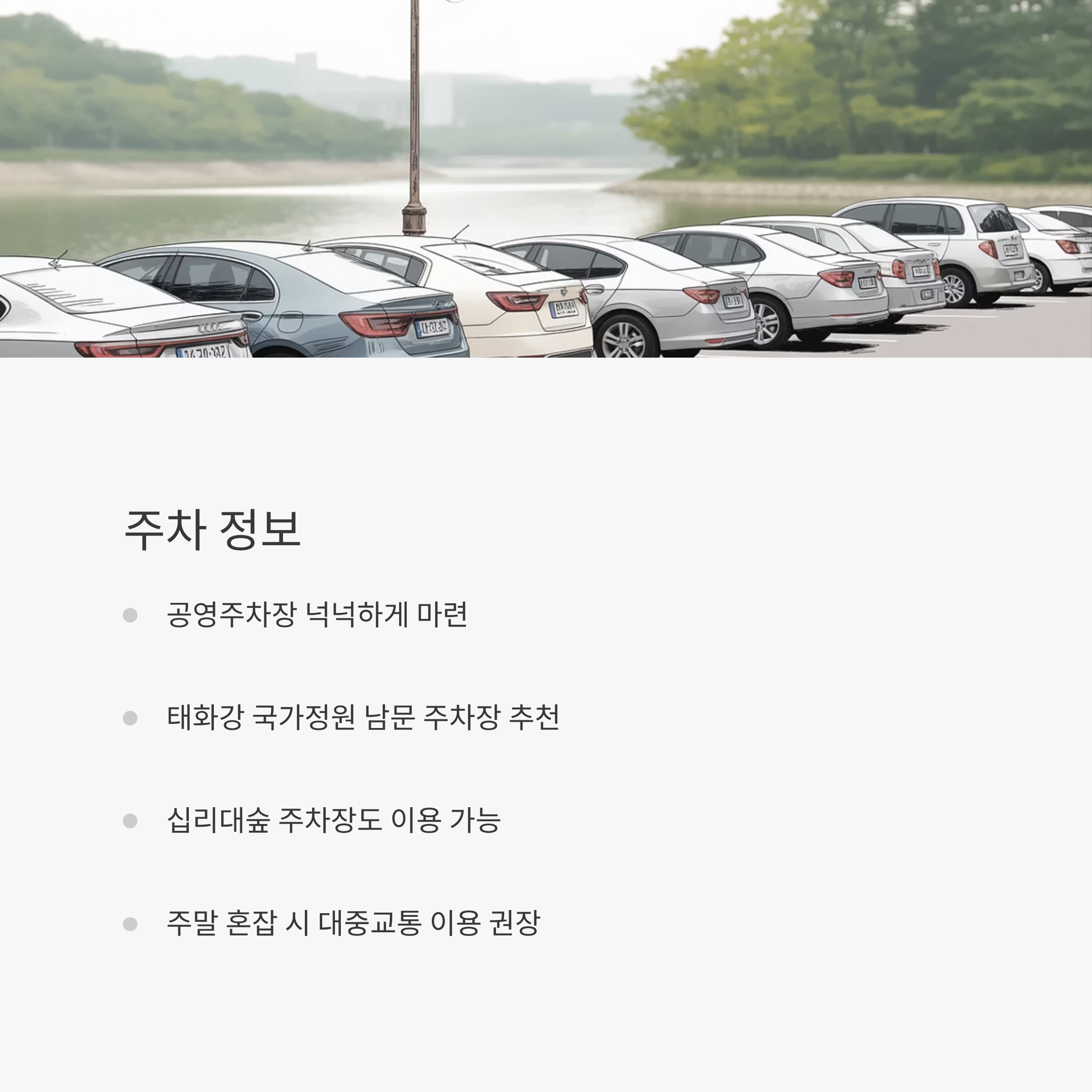 특히 ‘태화강 국가정원 남문 주차장’과 ‘십리대숲 주차장’을 가장 많이 이용하니 참고하세요. 주말에는 다소 혼잡할 수 있으니 대중교통 이용도 추천드립니다.