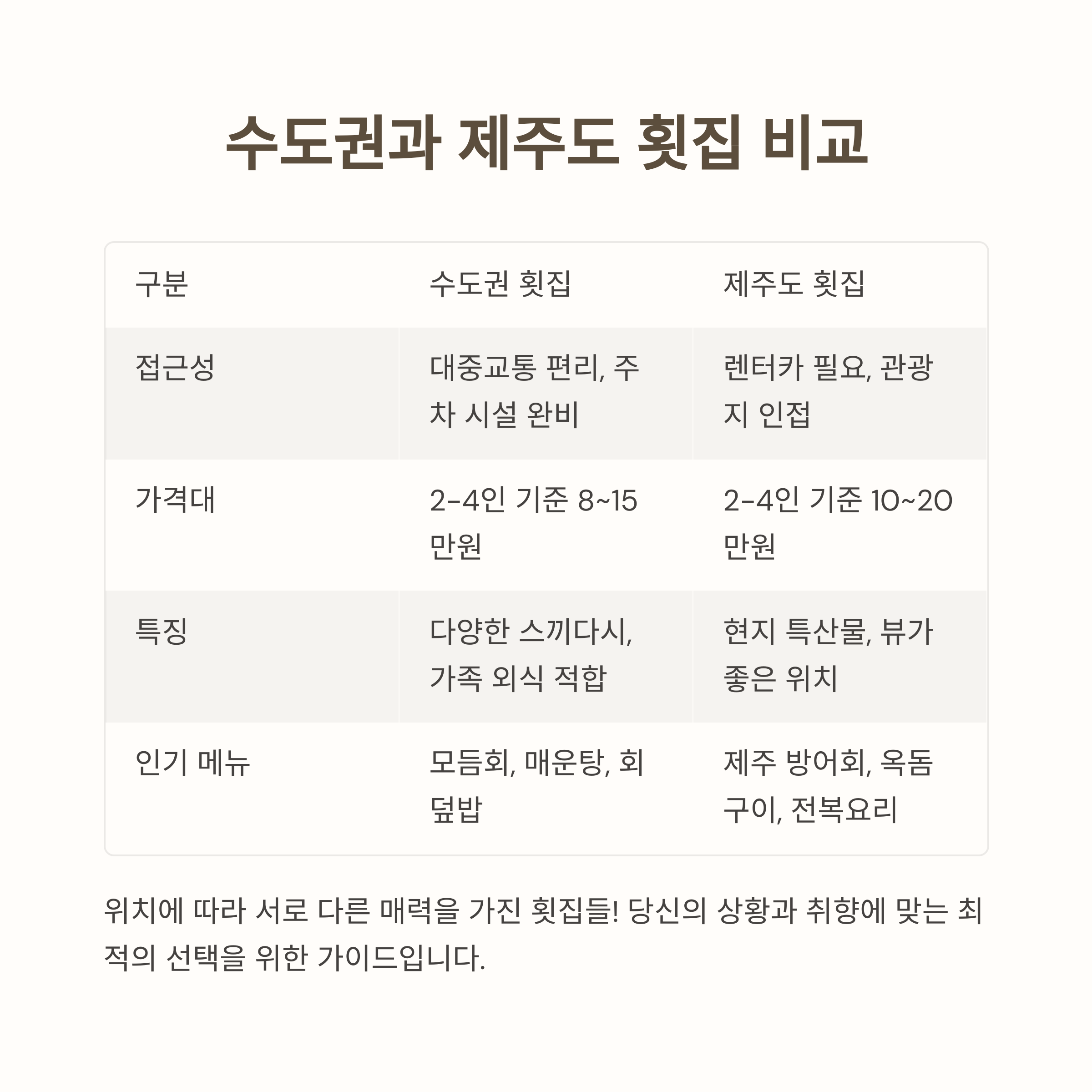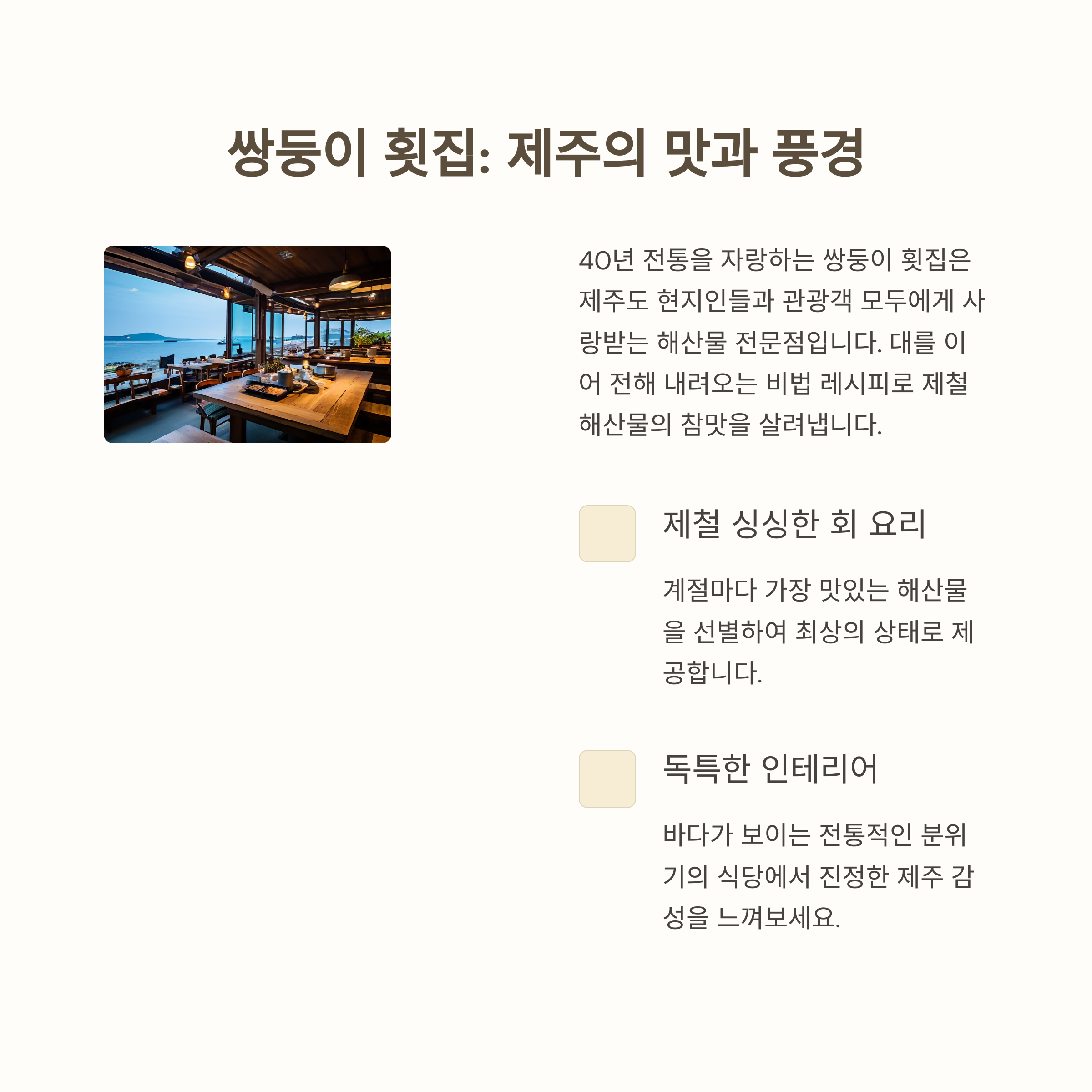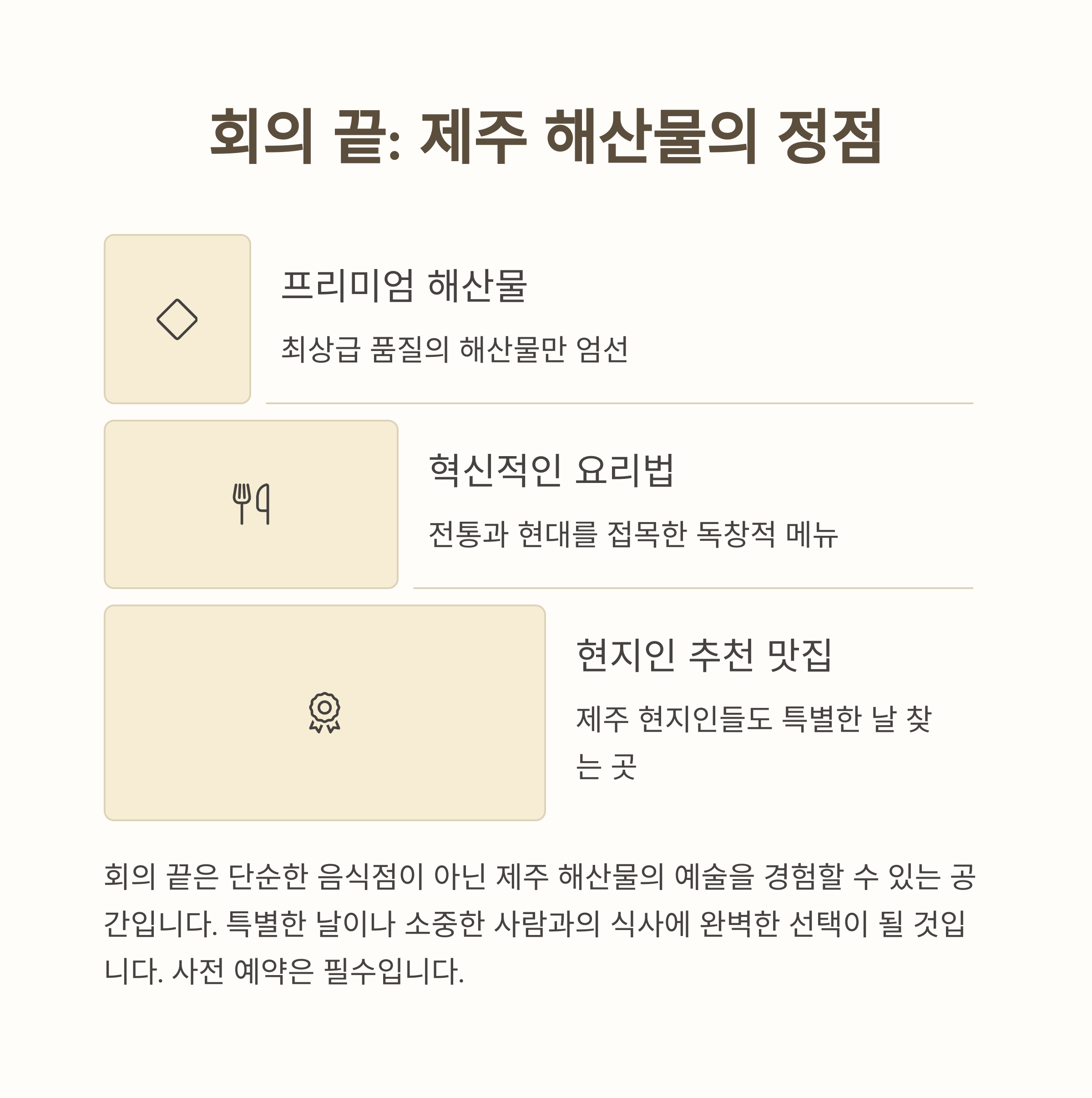반면 서귀포 횟집들은 제주 바다에서 바로 잡은 신선한 재료들로 차별화된 경험을 제공합니다. 쌍둥이 횟집은 두툼하게 썰어낸 광어와 우럭이 중심이며, 2인 스페셜 기준 약 15만원의 가격대입니다. 다양한 해산물 한상이 제공되어 여행객들의 만족도가 높습니다. 회의 끝은 제철 해산물과 고등어구이를 포함한 감성적인 구성으로 특히 젊은 커플과 가족 단위 손님에게 인기가 많습니다. 다만, 인기만큼 대기 시간은 긴 편이며 스끼다시 양에 대해 아쉬움을 느끼는 경우도 있습니다.