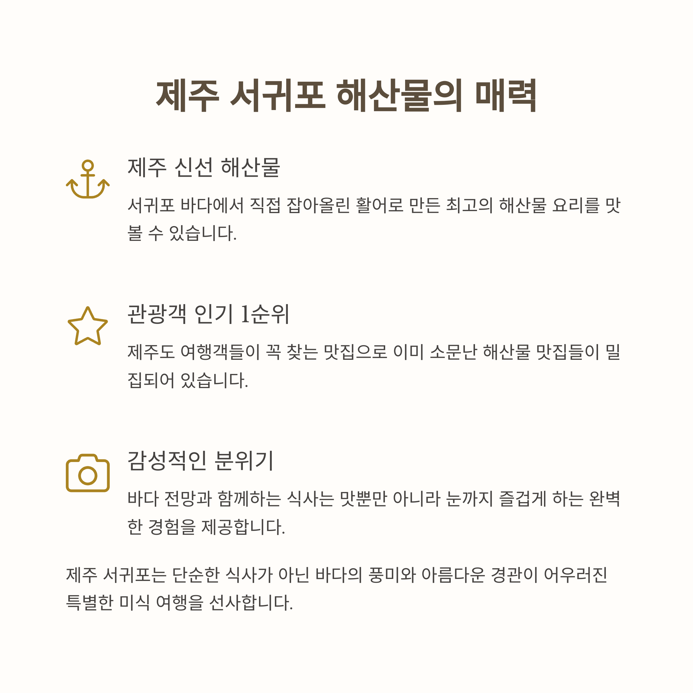 서귀포 횟집은 제주 여행의 묘미를 더해주며, 바다를 닮은 두툼한 회와 다양한 해산물의 조화가 뛰어납니다. 어디를 선택하든 각각의 매력을 살려 즐긴다면 잊지 못할 식사가 될 것입니다.