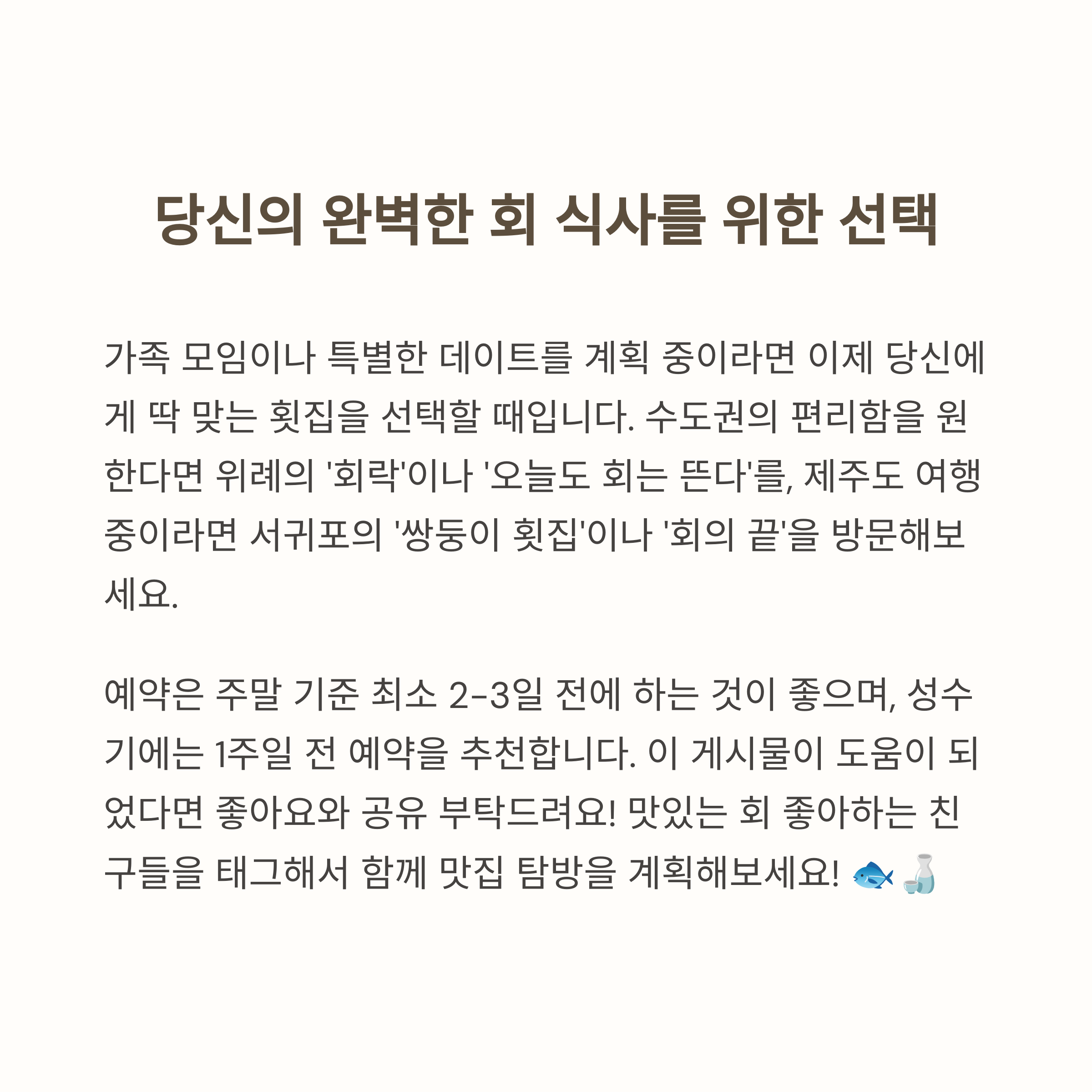 서귀포 횟집은 제주 여행 중 방문하는 특별한 경험을 선사하며, 신선도와 분위기 모두 우수합니다. 각자의 스타일과 여행 계획에 맞춰 선택하신다면 후회 없는 선택이 될 것입니다.