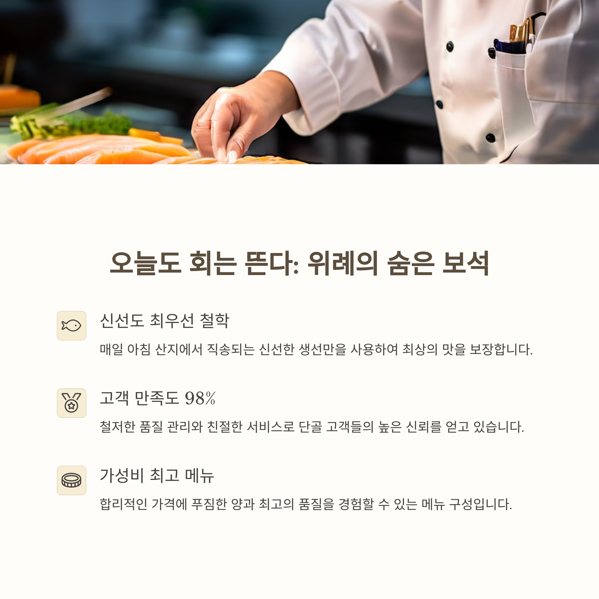 | 연어, 광어, 농어, 전복 (위례) / 광어, 우럭 (서귀포) | 위례 약 4만원 / 서귀포 약 15만원 | 부추전, 콘치즈, 계란찜 외 다양 (위례) / 단촐하지만 정갈 (서귀포) |