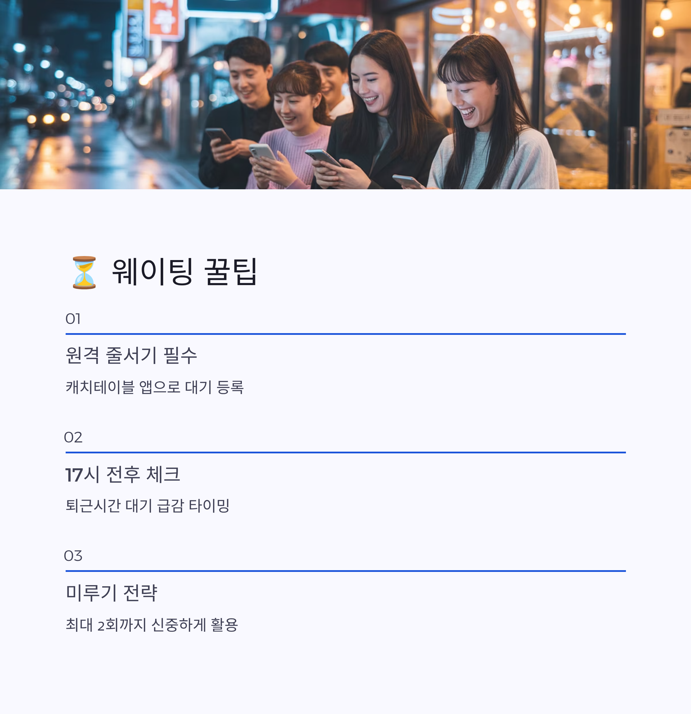 - 대기 시간 감안: 원격 줄 서기 필수, 미루기는 신중하게 사용하기