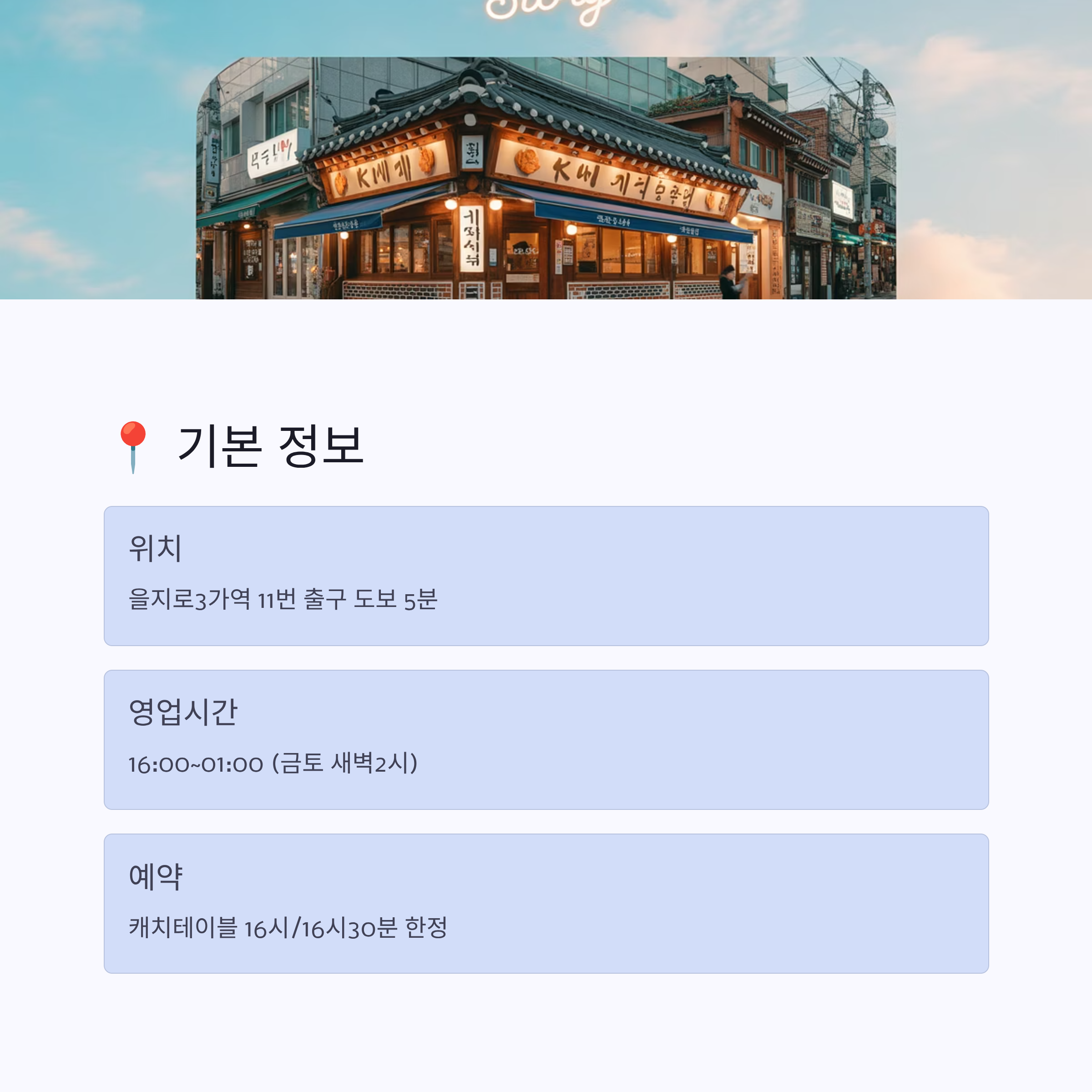 - 영업시간: 매일 16:00 ~ 01:00 (금·토는 새벽 2시까지)