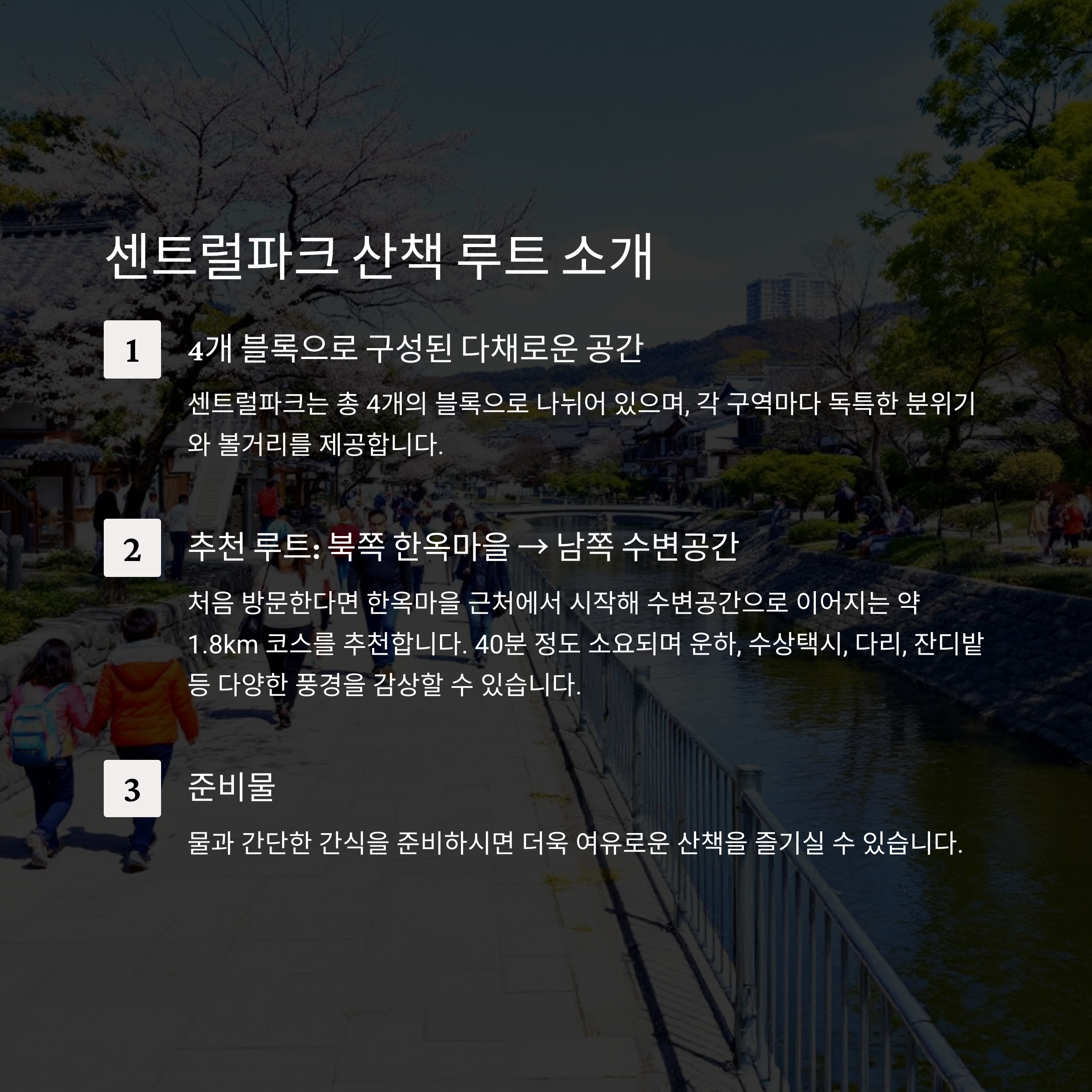 | 센트럴파크 시작점 | 한옥마을 근처 | 넓은 산책로와 전망대 |