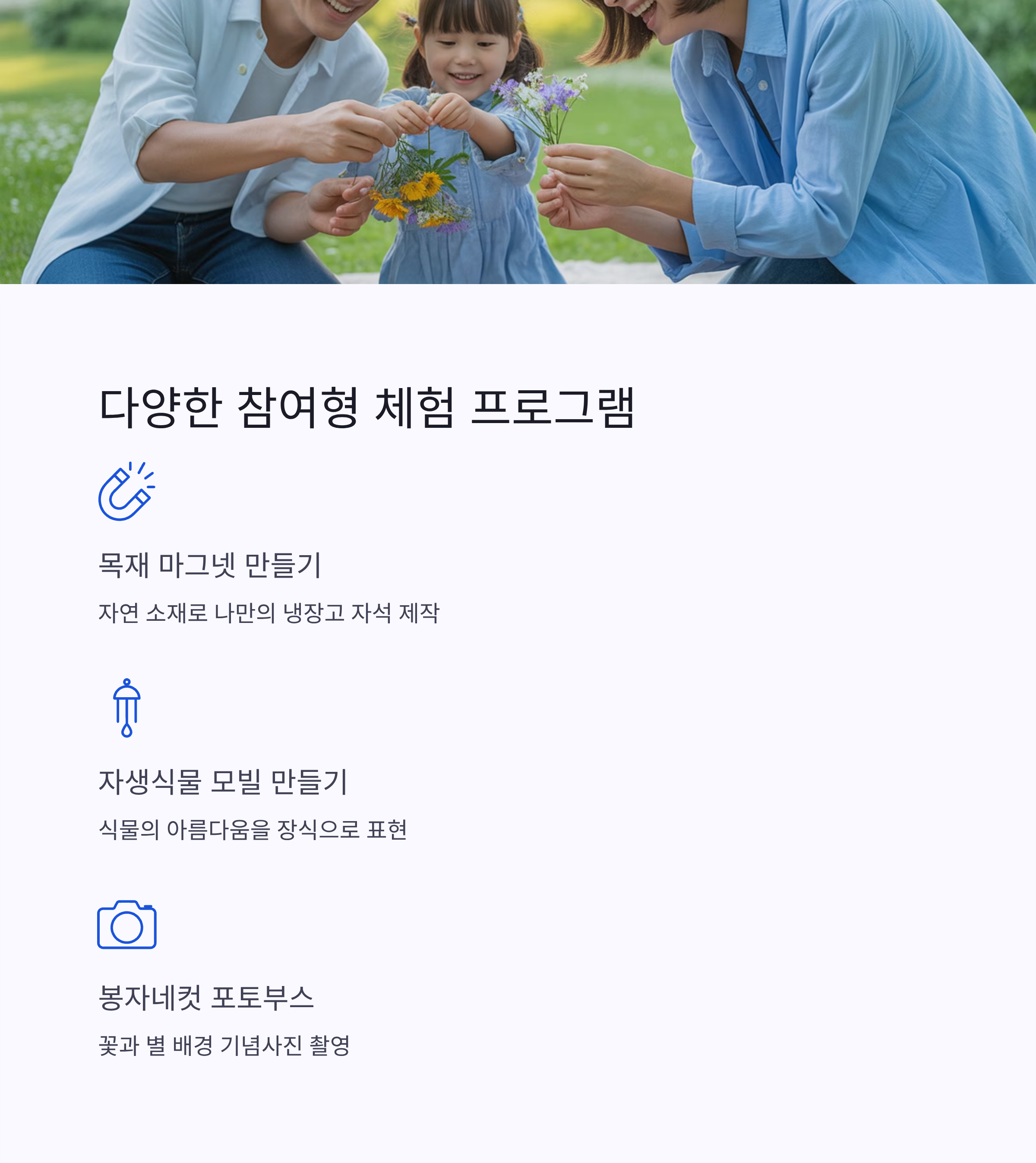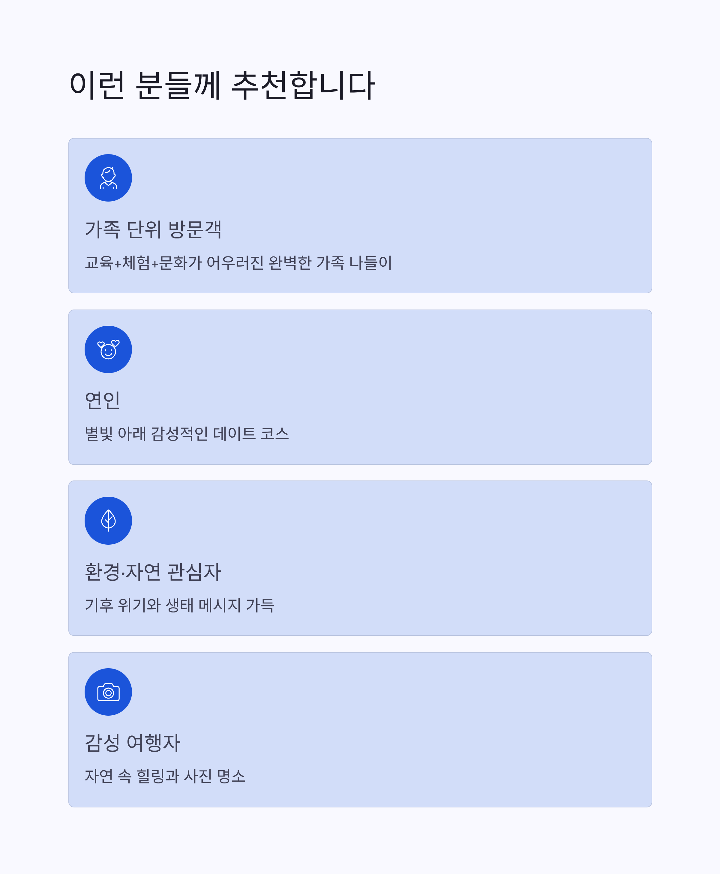 | 가족 단위 방문객 | 교육+체험+문화가 어우러져 온 가족이 즐길 수 있어요 |