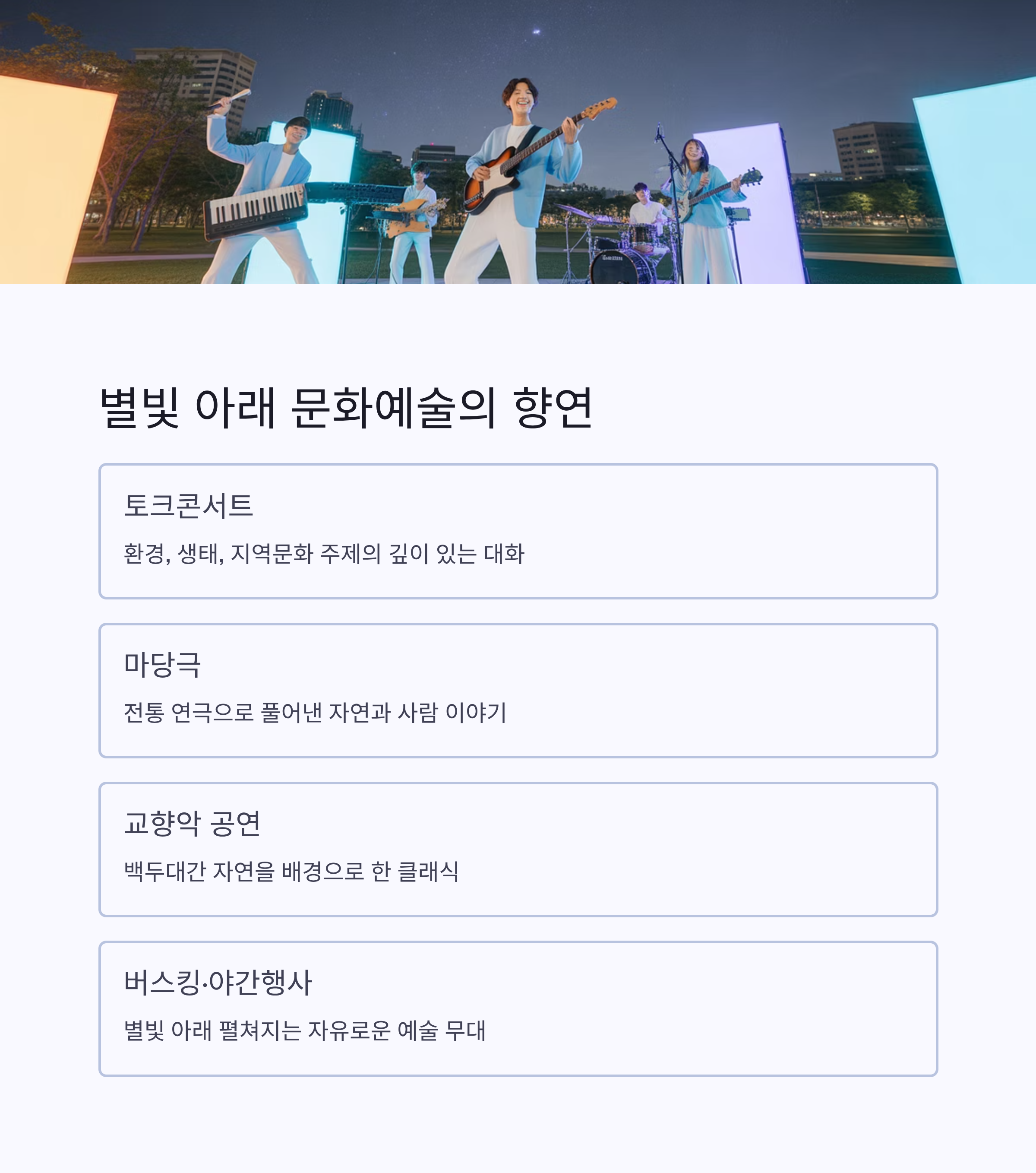 | 버스킹·야간행사 | 별빛 아래 펼쳐지는 자유로운 예술 무대 |