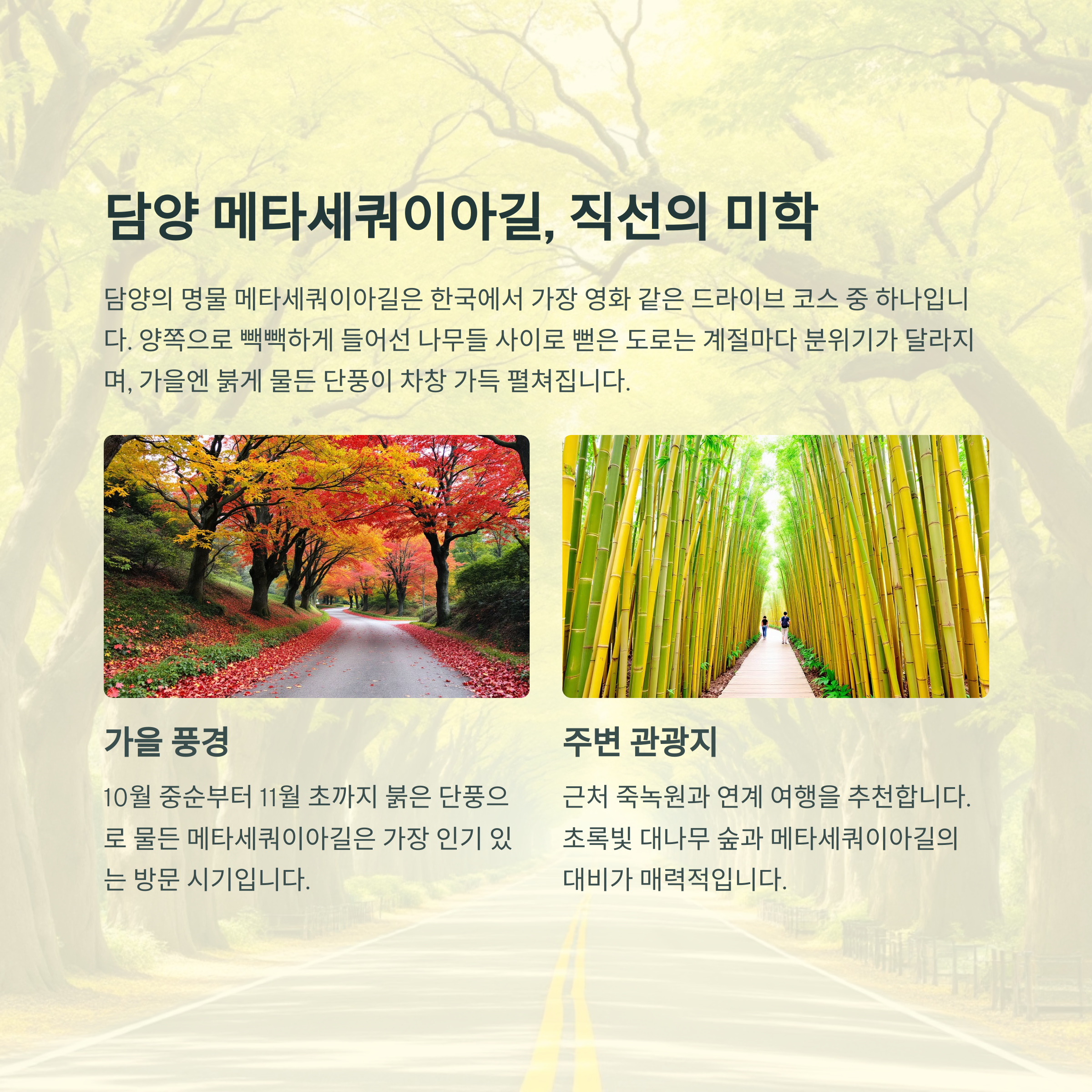 | 담양 메타길 | 영화 같은 직선 도로, 사계절 단풍 |