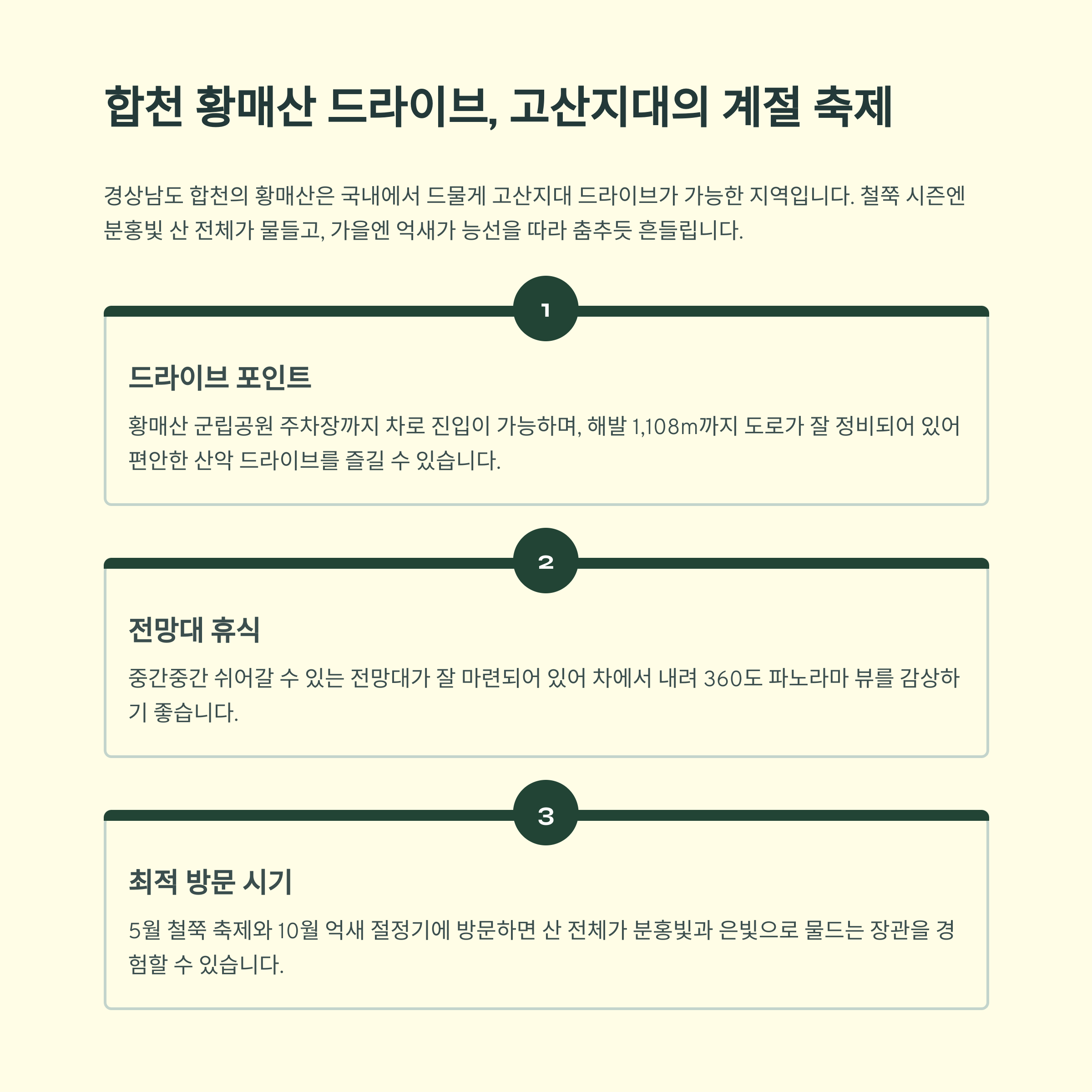 경상남도 합천의 황매산은 국내에서 드물게 고산지대 드라이브가 가능한 지역입니다. 철쭉 시즌엔 분홍빛 산 전체가 물들고, 가을엔 억새가 능선을 따라 춤추듯 흔들립니다. 황매산 군립공원 주차장까지 차로 진입이 가능하며, 중간중간 쉬어갈 수 있는 전망대도 잘 마련되어 있습니다.