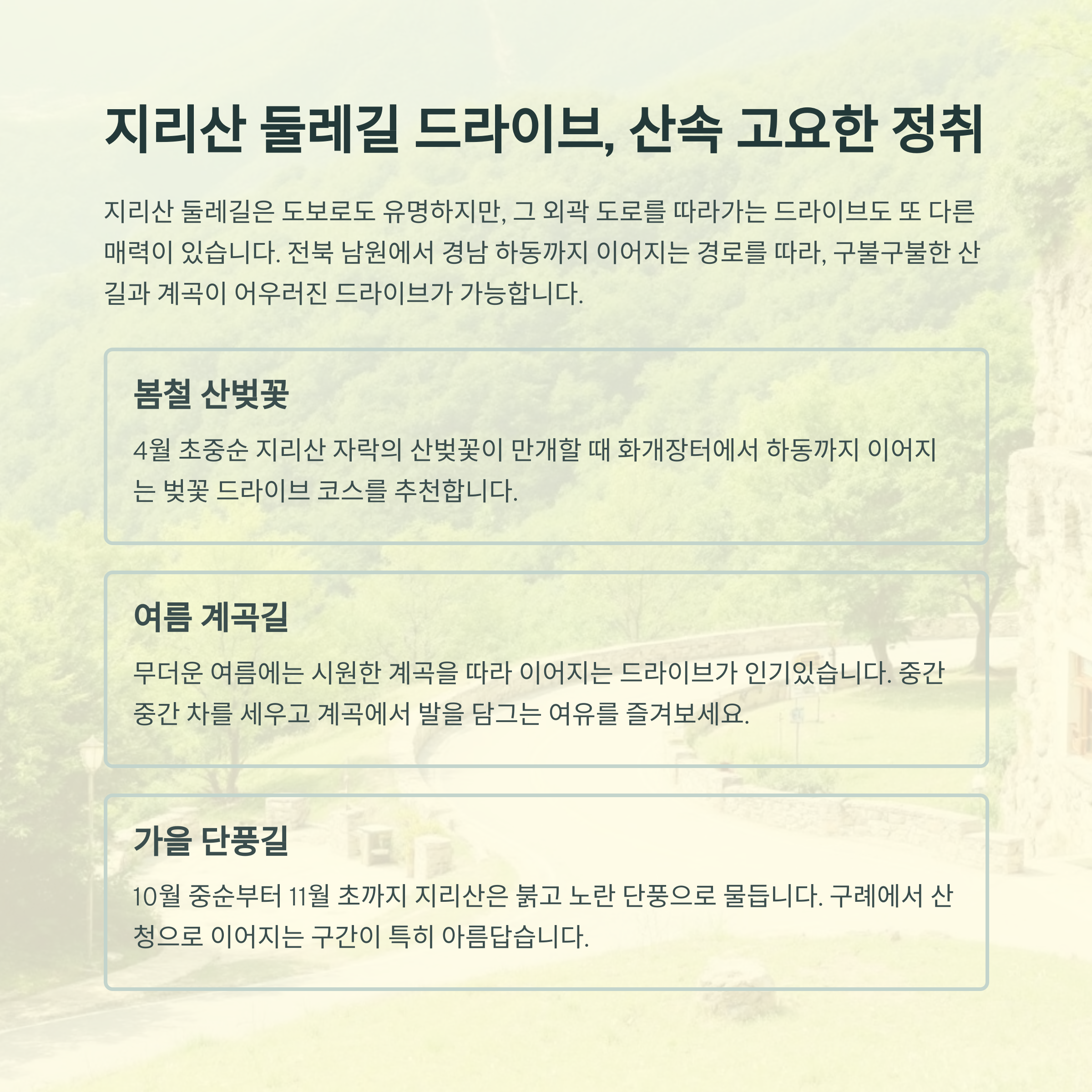 지리산 둘레길 드라이브, 산속 풍경과 고요한 정취