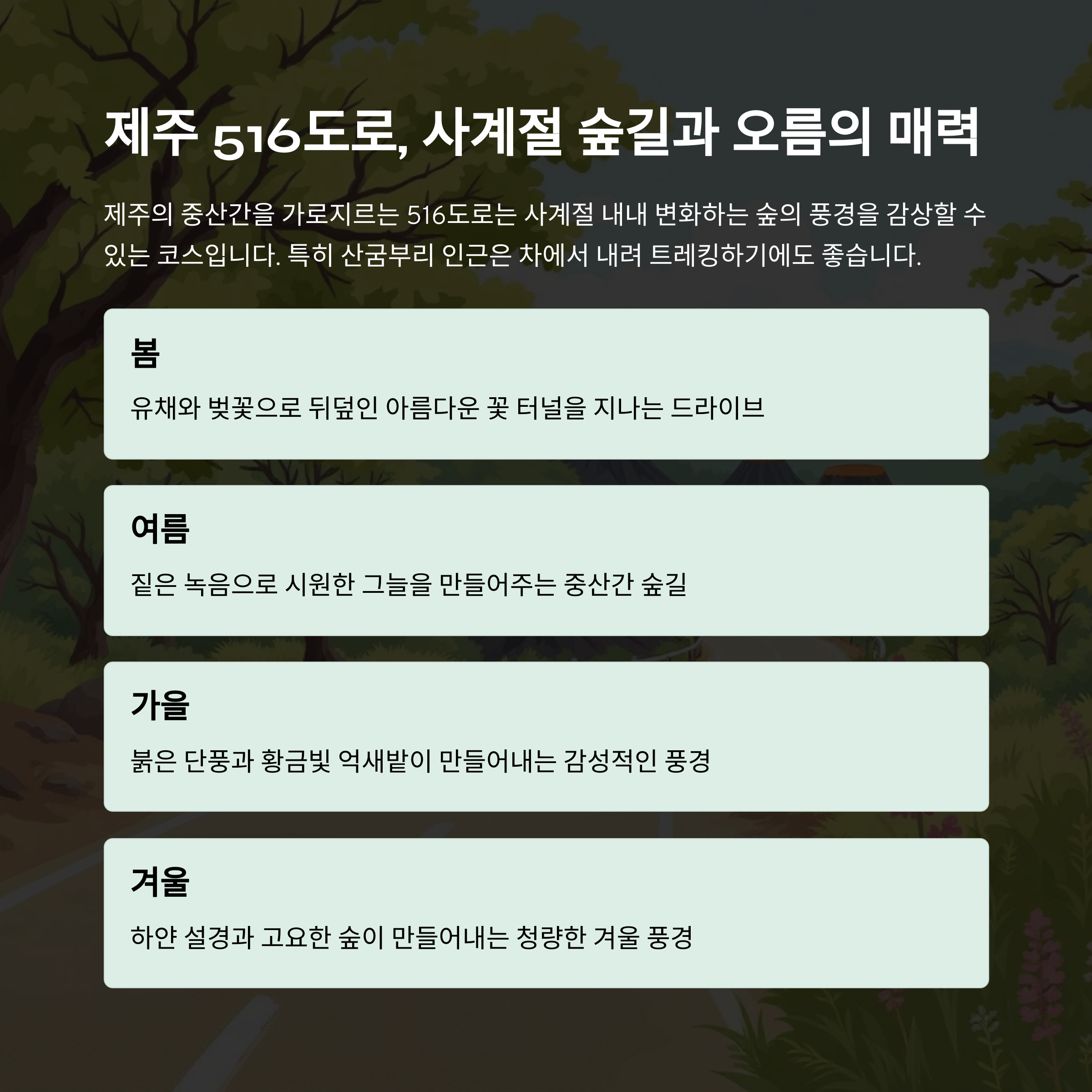 제주의 중산간을 가로지르는 516도로는 사계절 내내 변화하는 숲의 풍경을 감상할 수 있는 코스입니다. 봄에는 유채와 벚꽃, 여름에는 짙은 녹음, 가을엔 단풍, 겨울엔 설경이 이어져 언제 찾아도 새로운 분위기를 만납니다. 특히 산굼부리 인근은 차에서 내려 트레킹 하기에도 좋습니다.