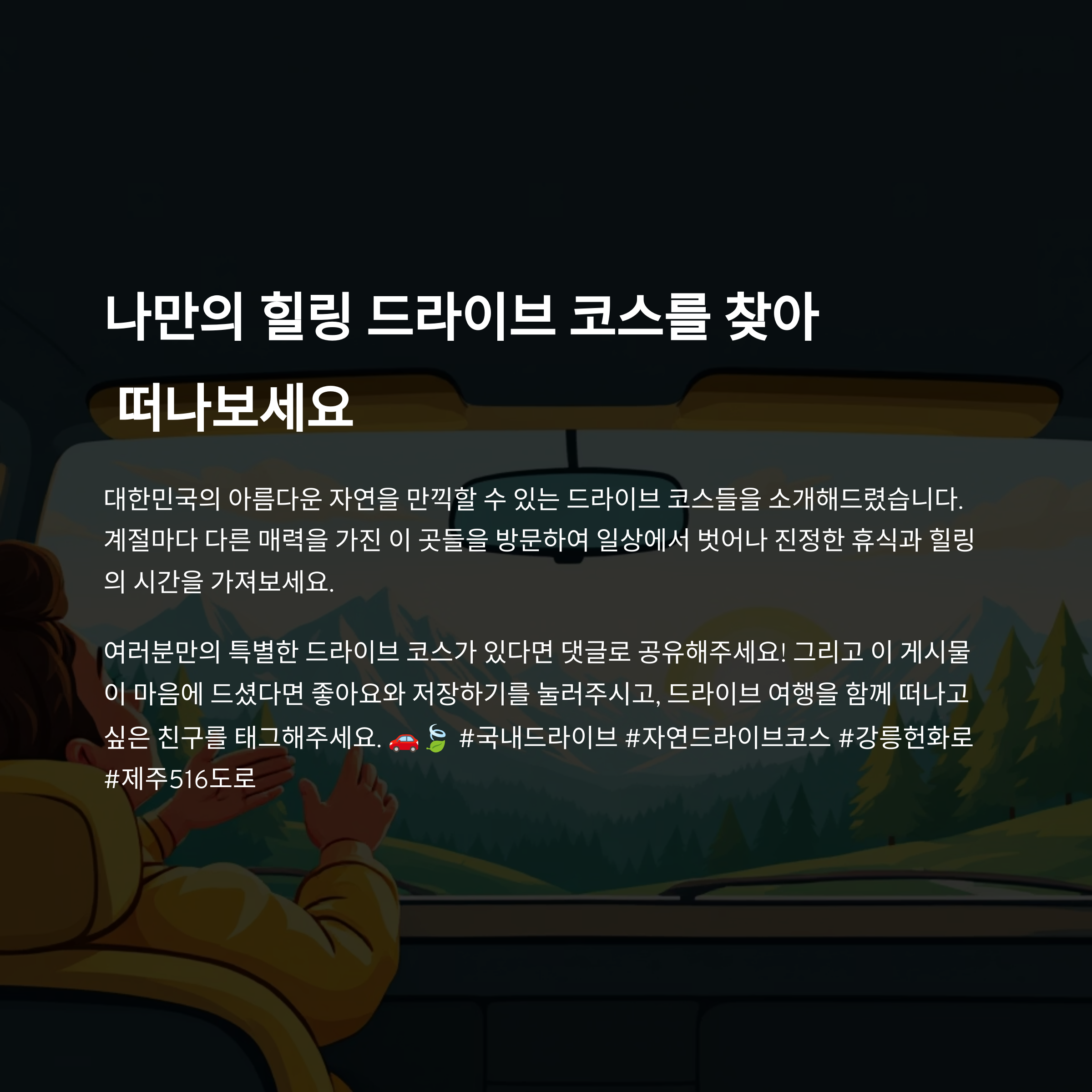 도시의 분주함을 벗어나 자연과 함께하는 드라이브는 마음을 치유하고 삶에 여유를 더해줍니다. 대한민국 곳곳에는 사계절의 아름다움을 그대로 품은 드라이브 코스들이 숨어 있는데요. 바다와 산, 숲길과 들판이 어우러진 풍경을 차창 너머로 만끽할 수 있는 자연 속 드라이브 코스를 지금부터 소개해드립니다.