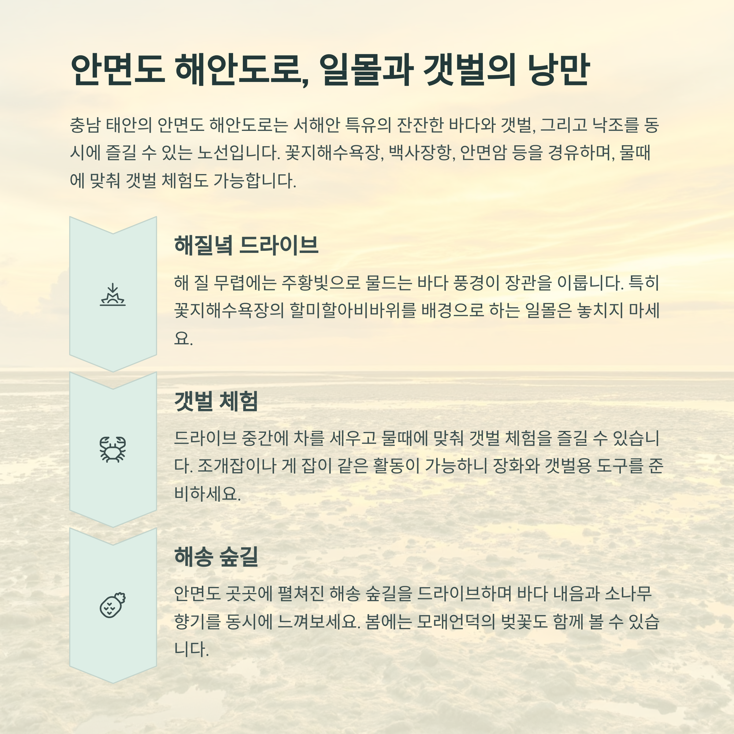 | 안면도 해안도로 | 갯벌 체험, 낙조 감상 |