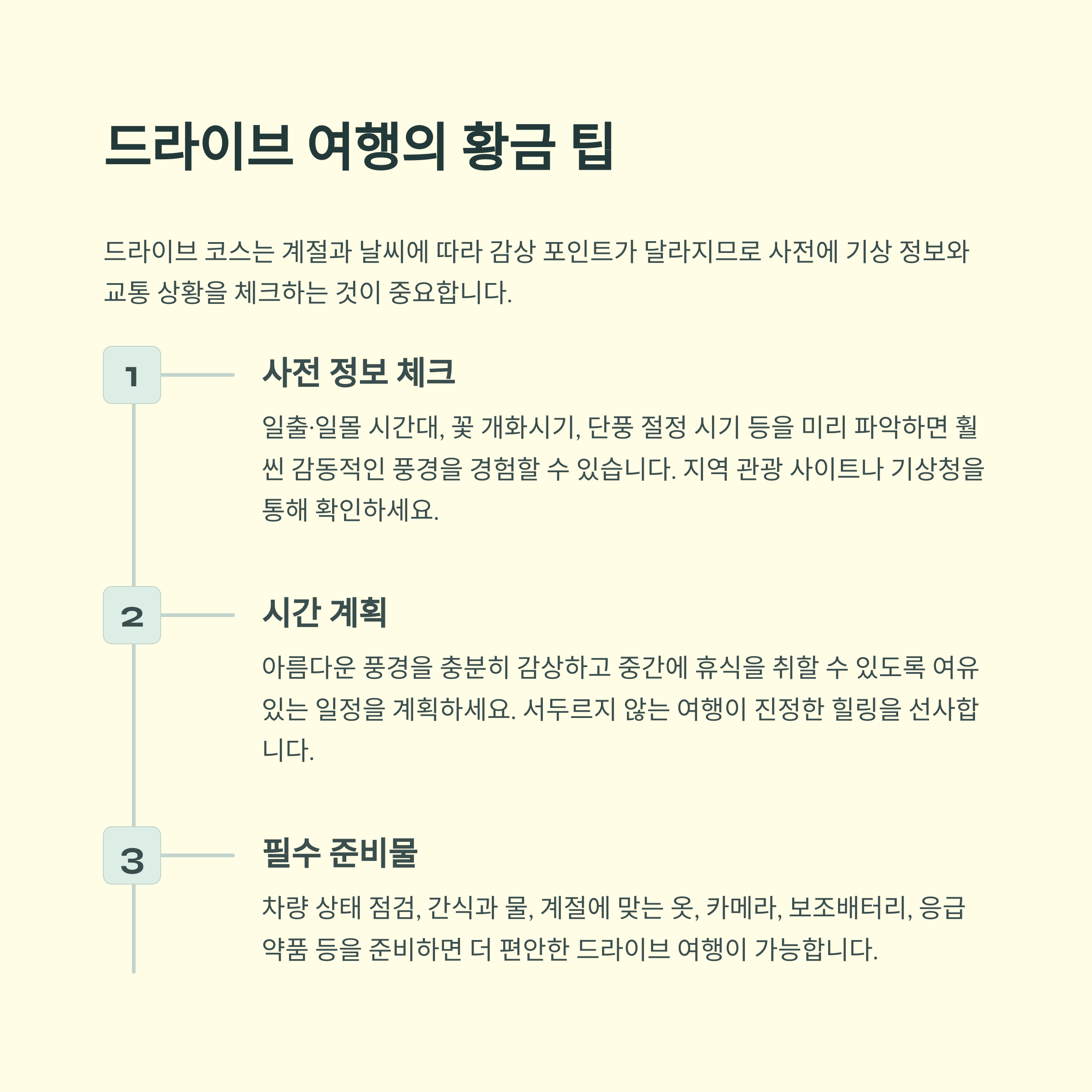 드라이브 코스는 계절과 날씨에 따라 감상 포인트가 달라지므로 사전에 기상 정보와 교통 상황을 체크하는 것이 중요합니다. 또한, 일출·일몰 시간대, 꽃 개화시기, 단풍 절정 시기 등을 미리 파악하면 훨씬 감동적인 풍경을 경험할 수 있습니다.