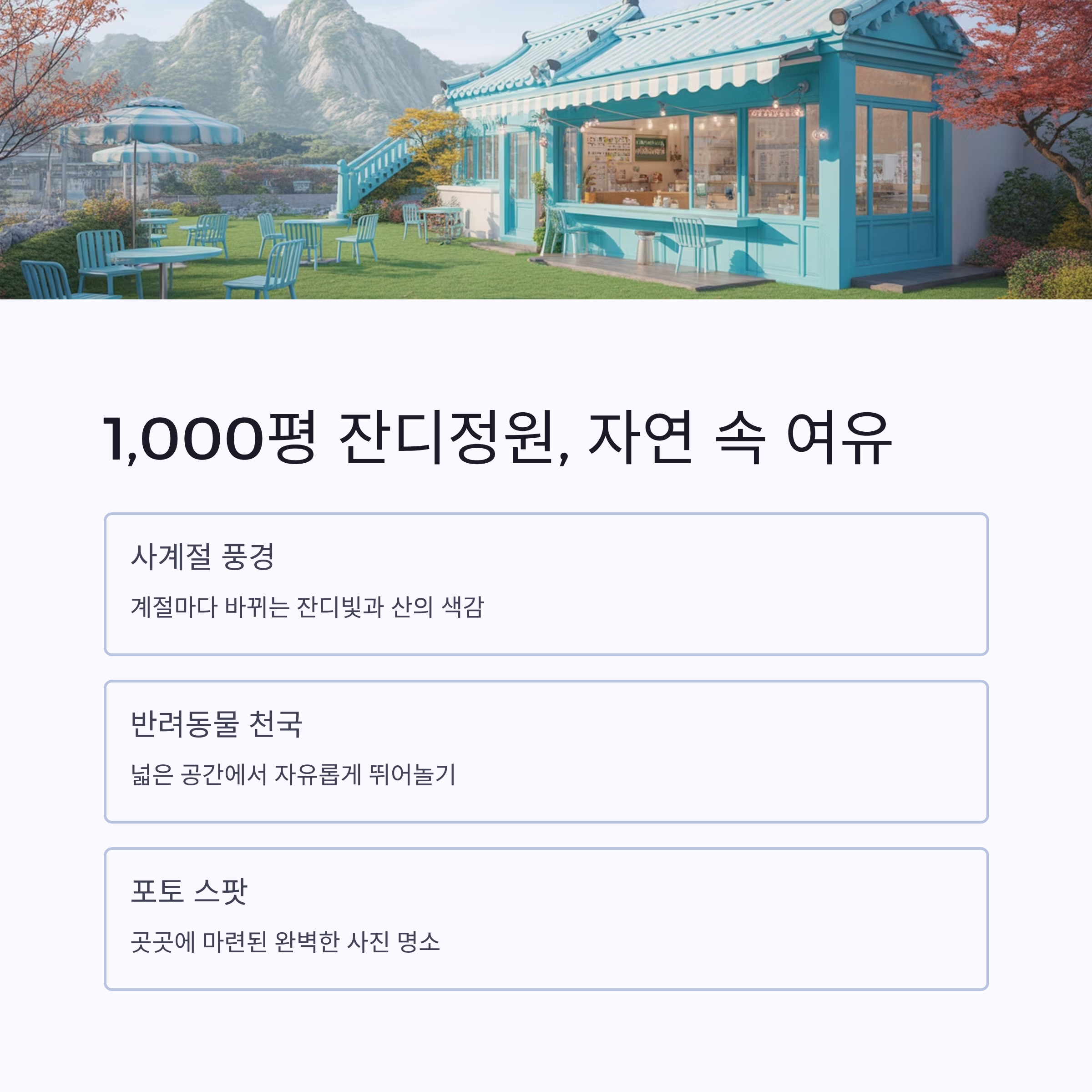 | 야외 잔디정원 | 반려동물 동반 가능, 포토존 다수 |