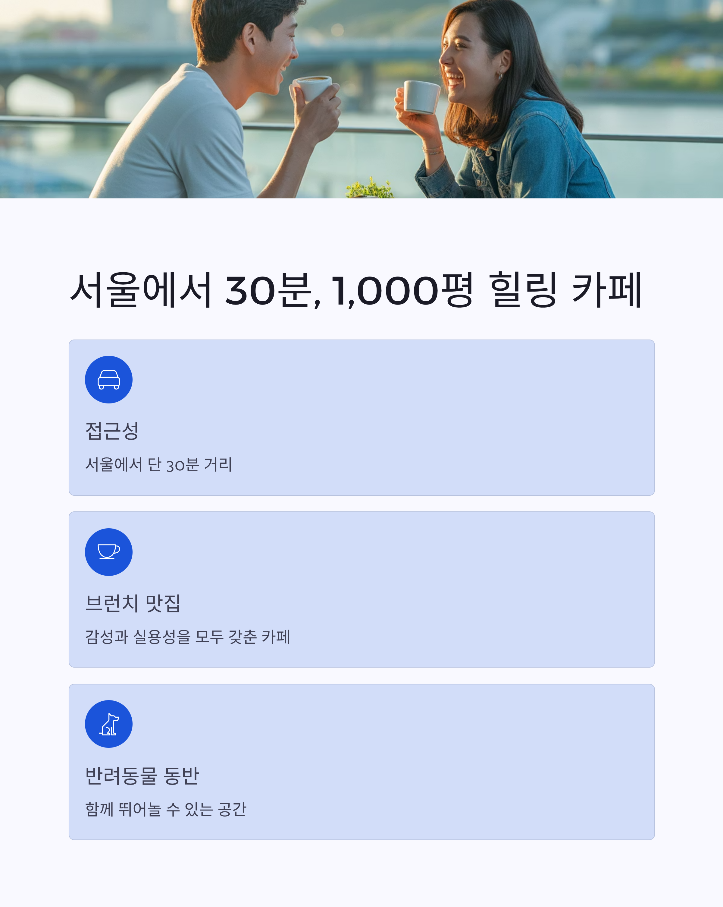 서울에서 단 30분 거리. 드라이브 코스와 브런치 맛집, 반려동물 동반이 가능한 힐링 카페로 입소문을 타고 있는 곳이에요.