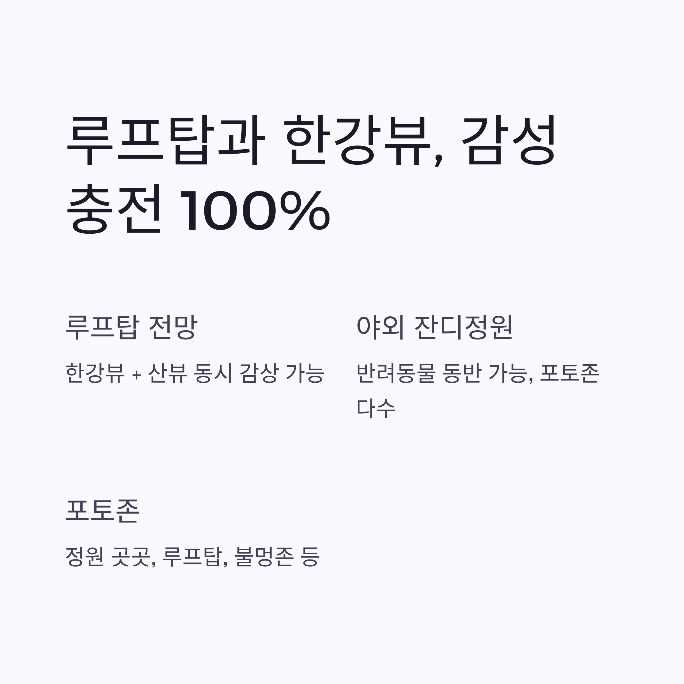 | 루프탑 전망 | 한강뷰 + 산뷰 동시 감상 가능 |