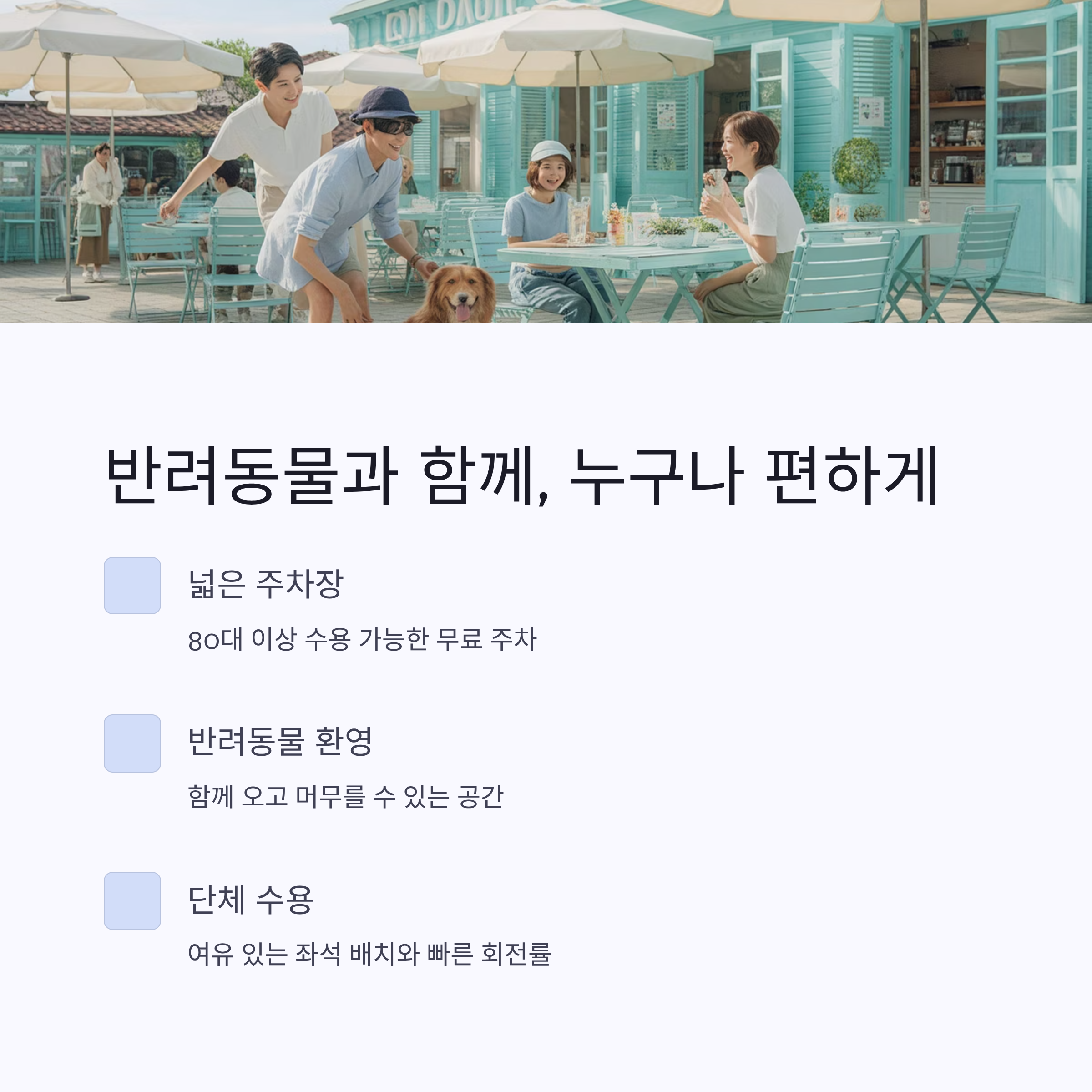 | 야외 잔디정원 | 반려동물 동반 가능, 포토존 다수 |