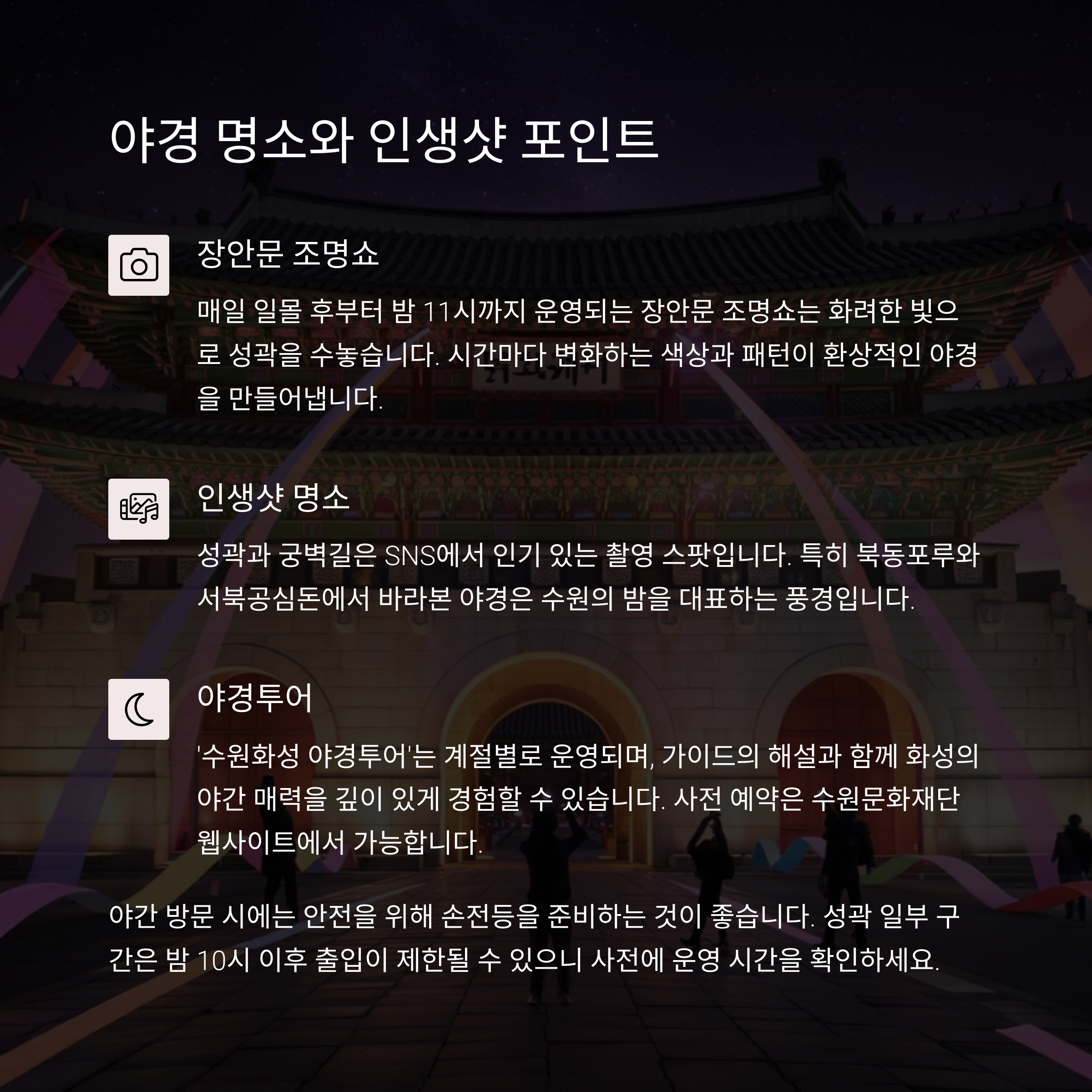 성곽 조명이 켜지면서 환상적인 야경이 펼쳐지죠.
