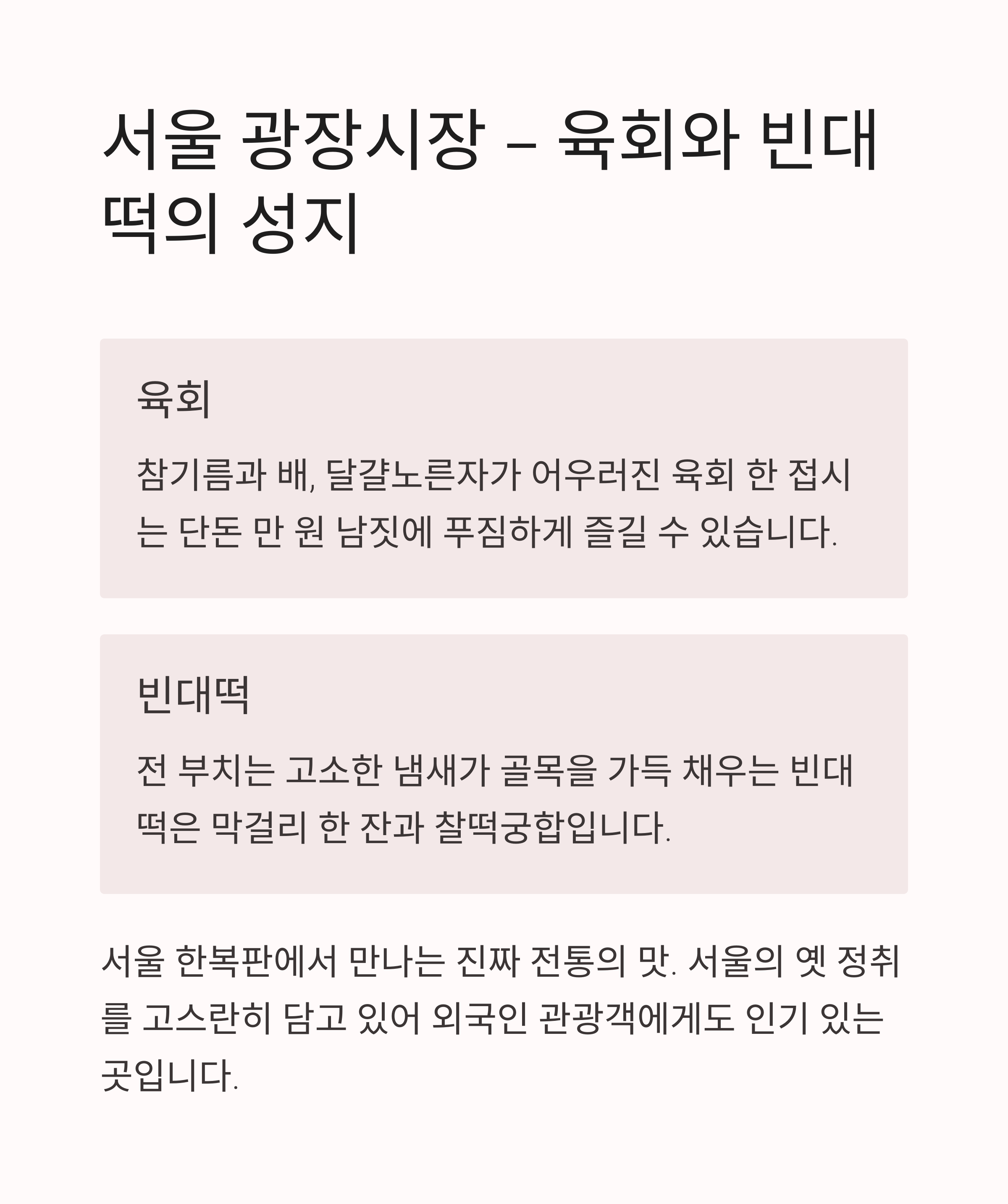 | 광장시장 | 서울 | 육회/빈대떡 | 서울 도심 속 전통의 맛 |