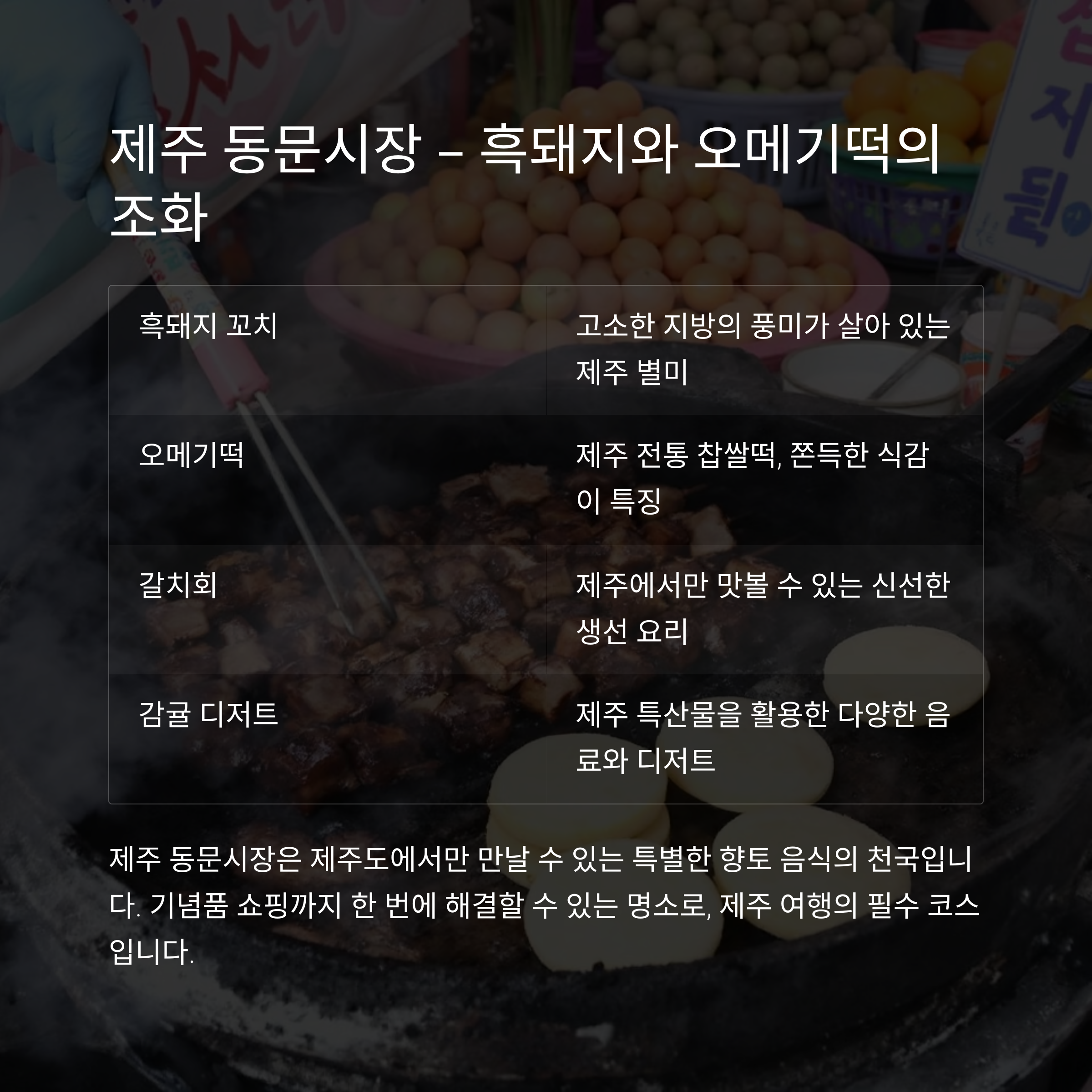 | 동문시장 | 제주 | 흑돼지/오메기떡 | 제주도 로컬 푸드의 정수 |