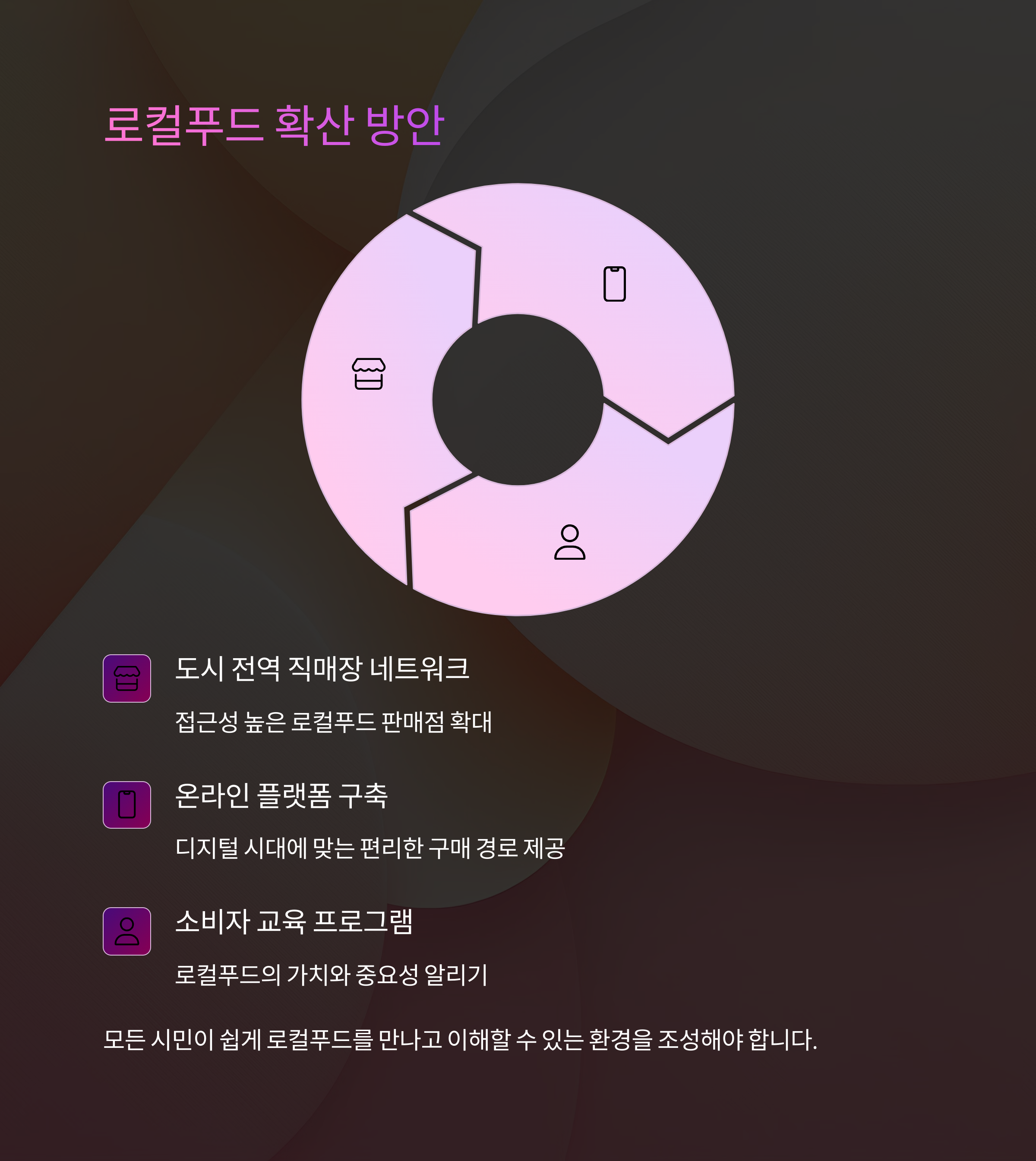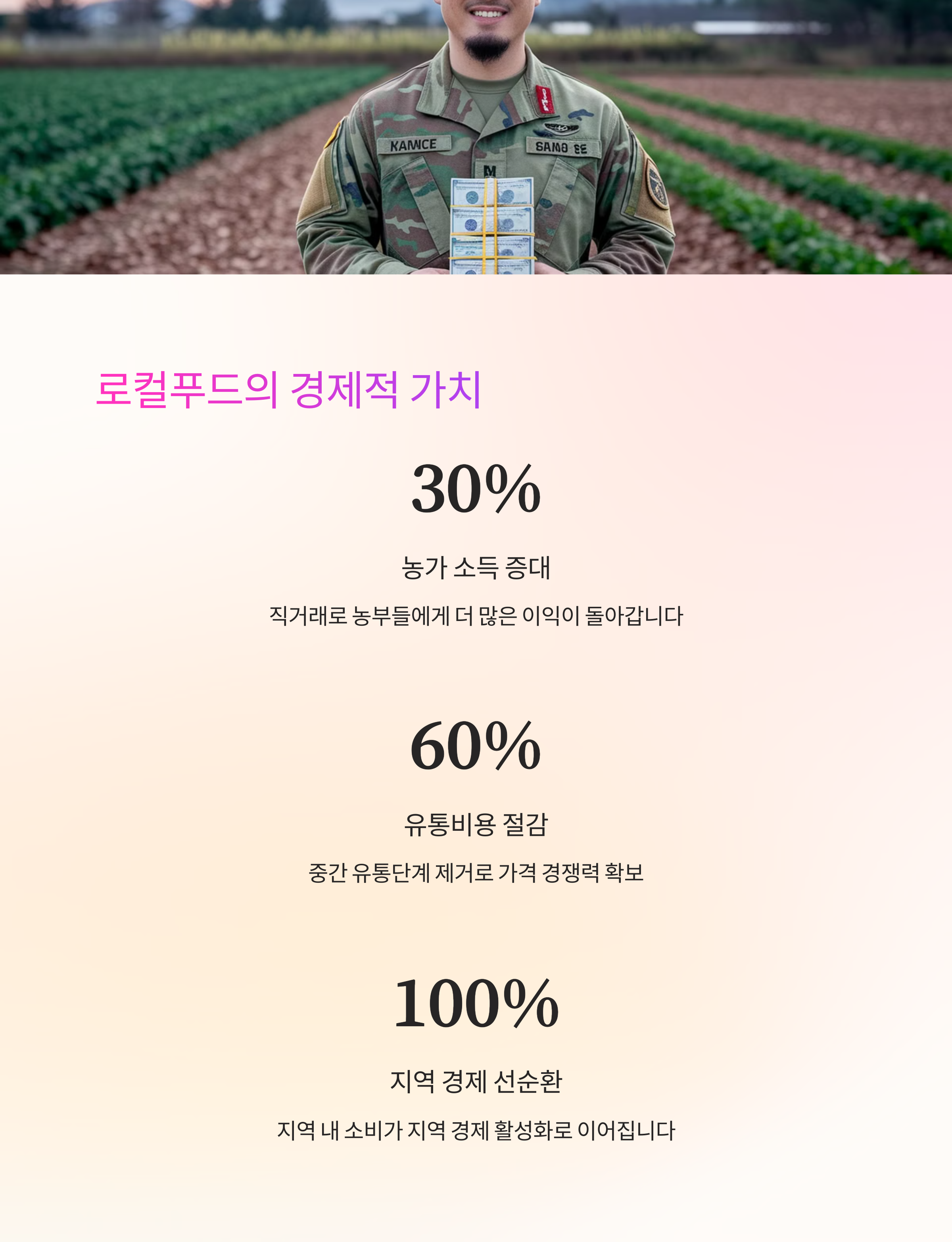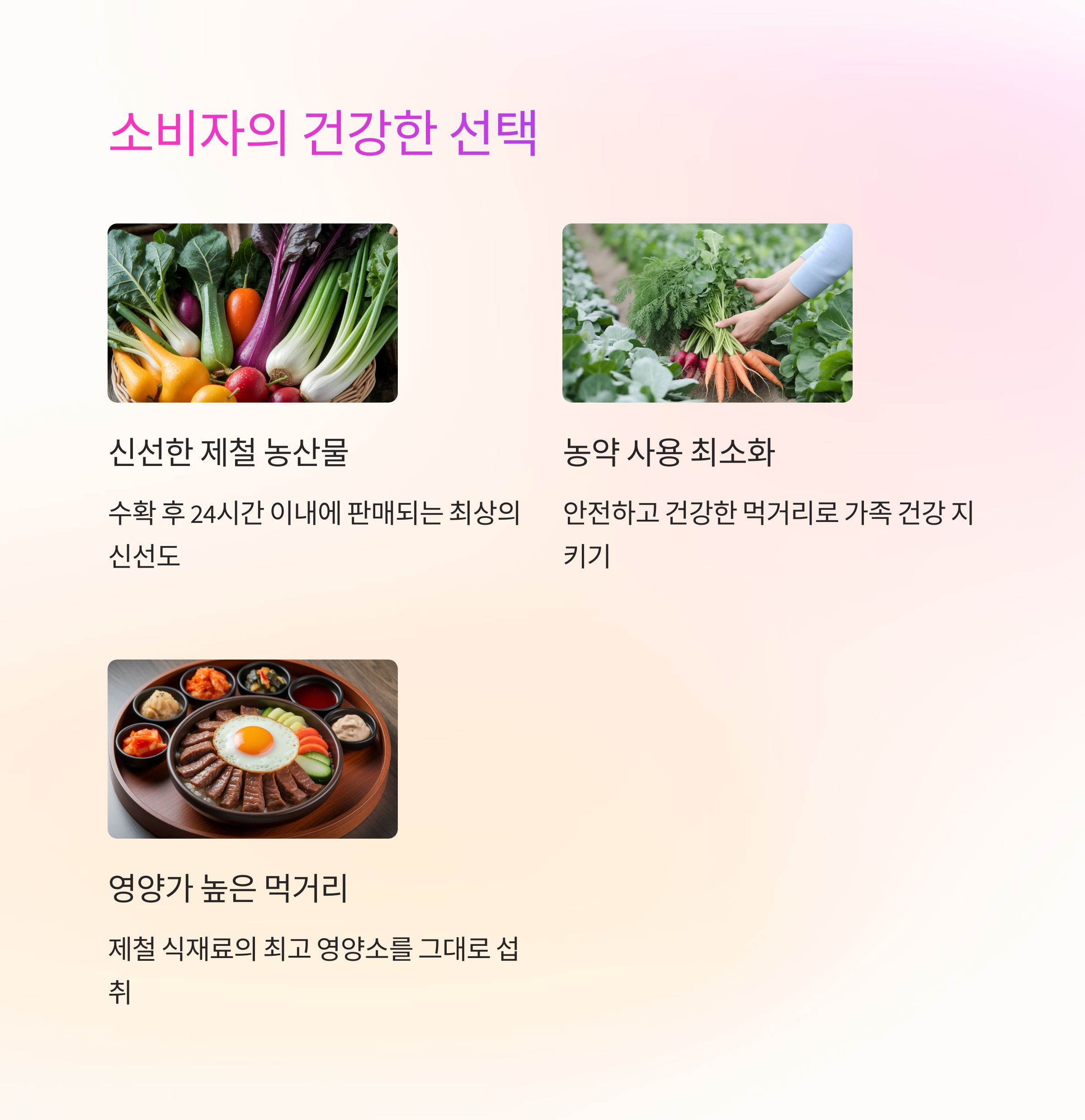 | 농산물 직접 유통, 생산자-소비자 신뢰 형성 | 횡성한우, 금산 인삼 등 지역 고유 먹거리 | 김치찌개, 불고기 등 인기 음식 기반 마케팅 |