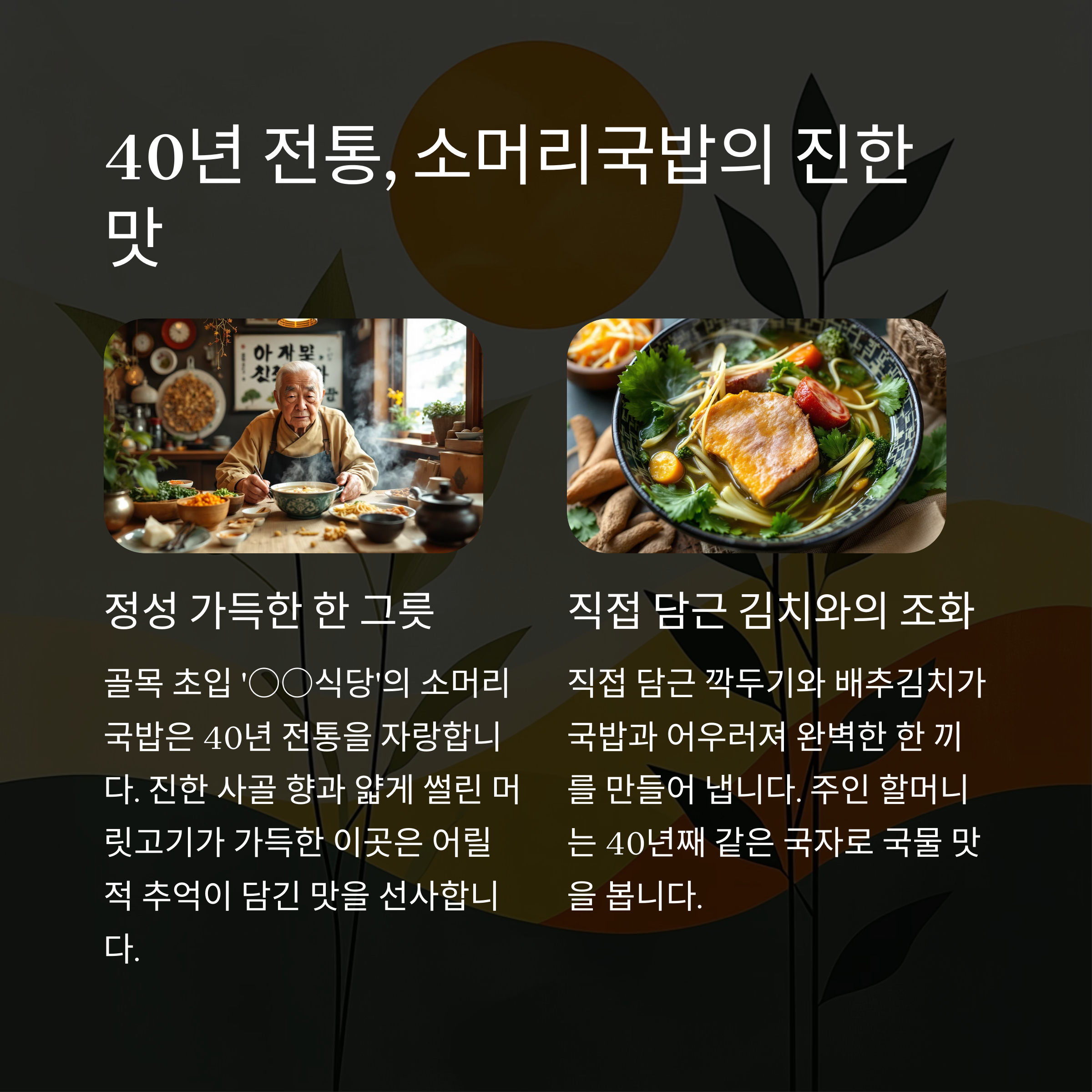 어릴 적 추억이 밴 국밥 맛을 찾고 있다면, 골목 초입의 ‘○○식당’을 추천합니다. 메뉴는 단 하나, 소머리국밥. 진한 사골 향에 얇게 썰린 머리 고기가 가득 올라가고, 직접 담근 깍두기와 배추김치가 어우러지는 순간 입안이 고창이 됩니다. 주인 할머니는 40년째 같은 국자로 국물 맛을 봅니다.