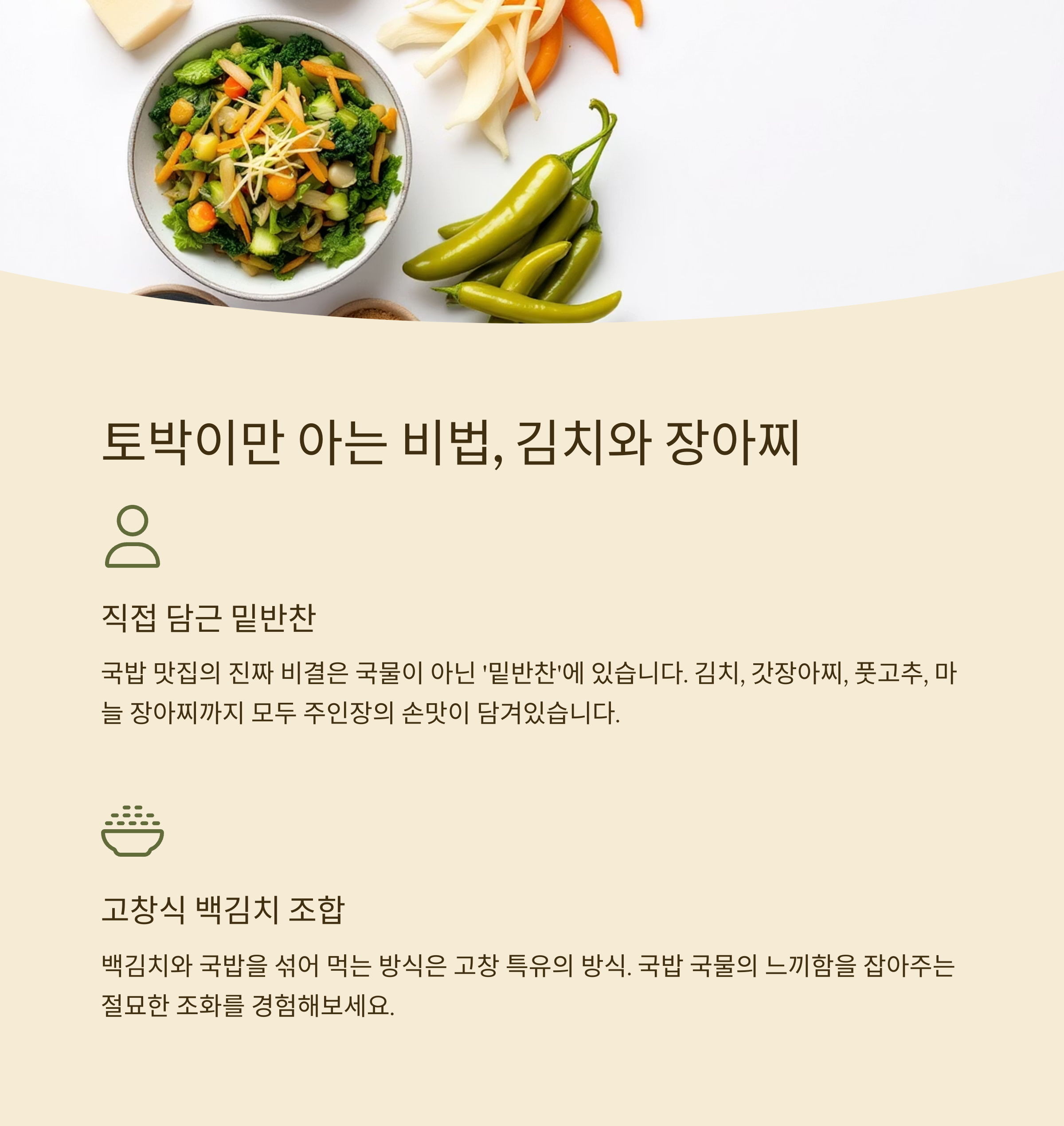국밥 맛집을 판가름하는 건 국물도 고기도 아닌 ‘밑반찬’이라는 말이 있습니다. 고창 식당들은 김치, 갓장아찌, 풋고추, 마늘 장아찌까지 직접 담가냅니다. 특히 백김치와 섞어 먹는 방식은 고창 특유의 방식으로, 국밥 국물의 느끼함을 잡아줍니다.