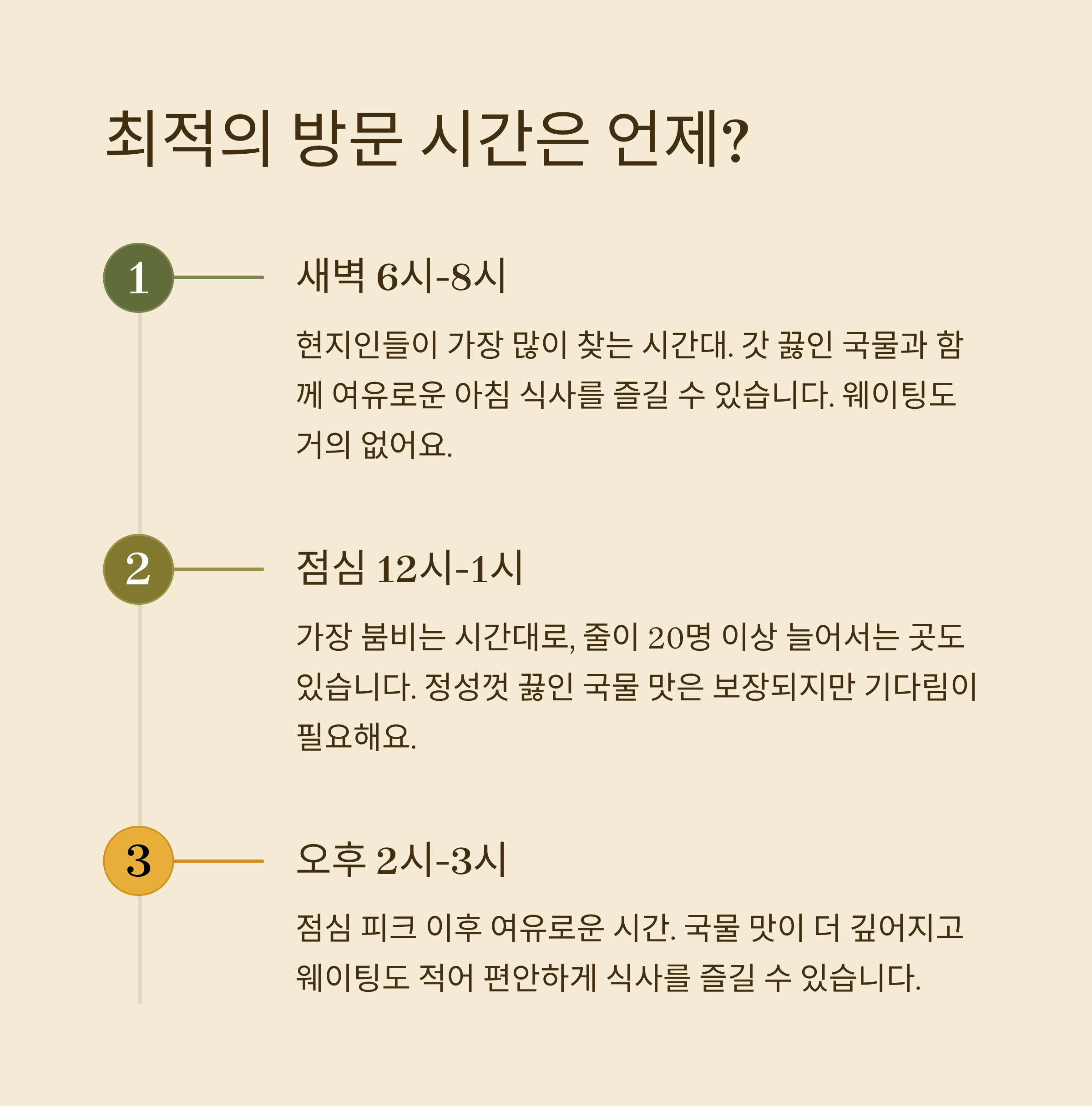 현지인들은 대부분 오전 6시8시 사이, 혹은 점심 피크 이후인 오후 2시 3시에 찾습니다. 이 시간대에는 웨이팅도 적고, 국물도 갓 끓인 상태라 가장 깊은 맛을 느낄 수 있습니다. 점심 피크엔 줄이 20명 넘게 늘어서는 곳도 있으니 시간대 공략이 필요합니다.