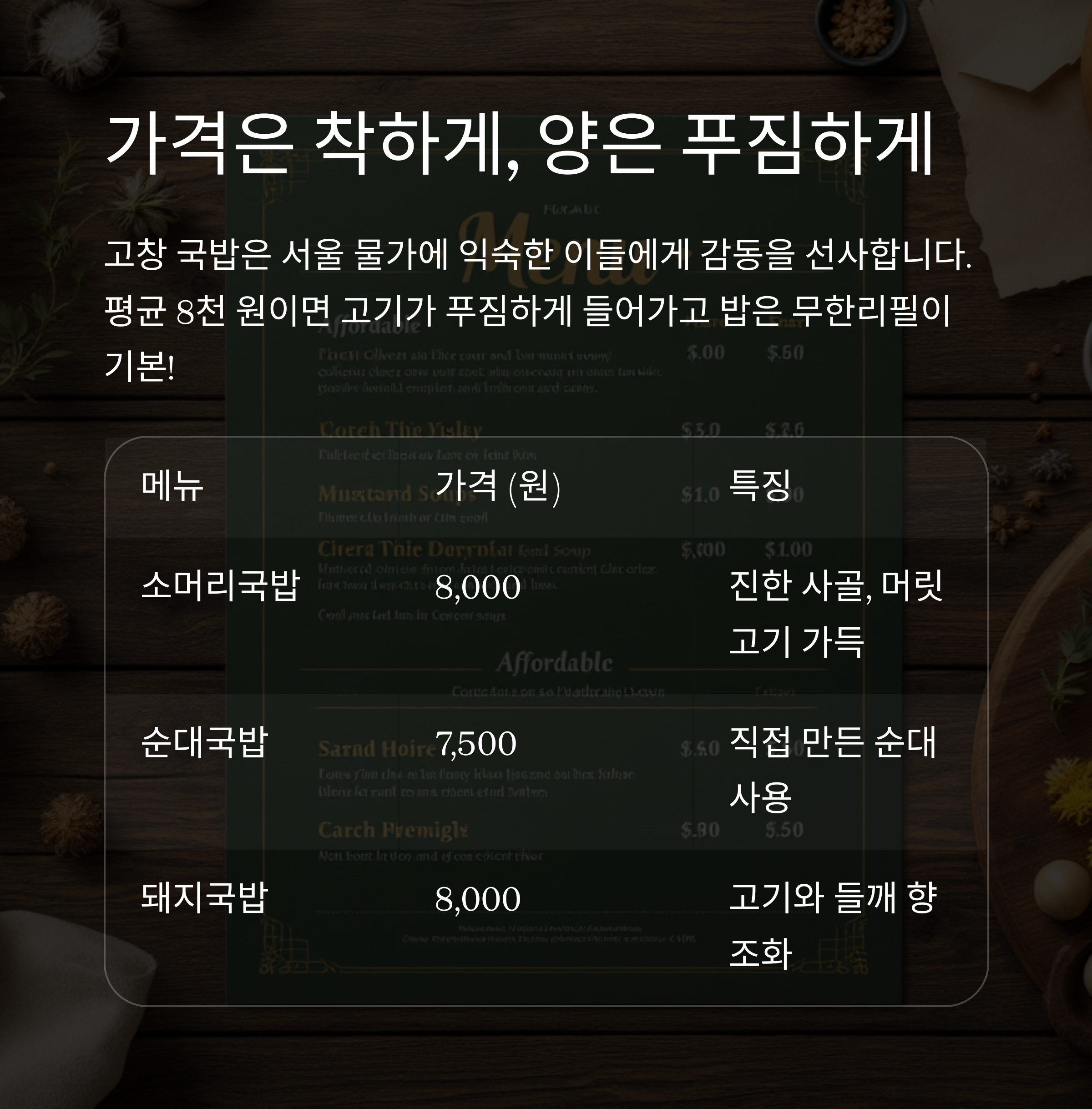 고창 국밥은 서울 물가에 익숙한 이들에겐 감동입니다. 보통 8천 원이면 고기가 푸짐하게 들어가고, 밥은 무한 리필. 아래 표는 주요 국밥 메뉴별 가격대입니다.
