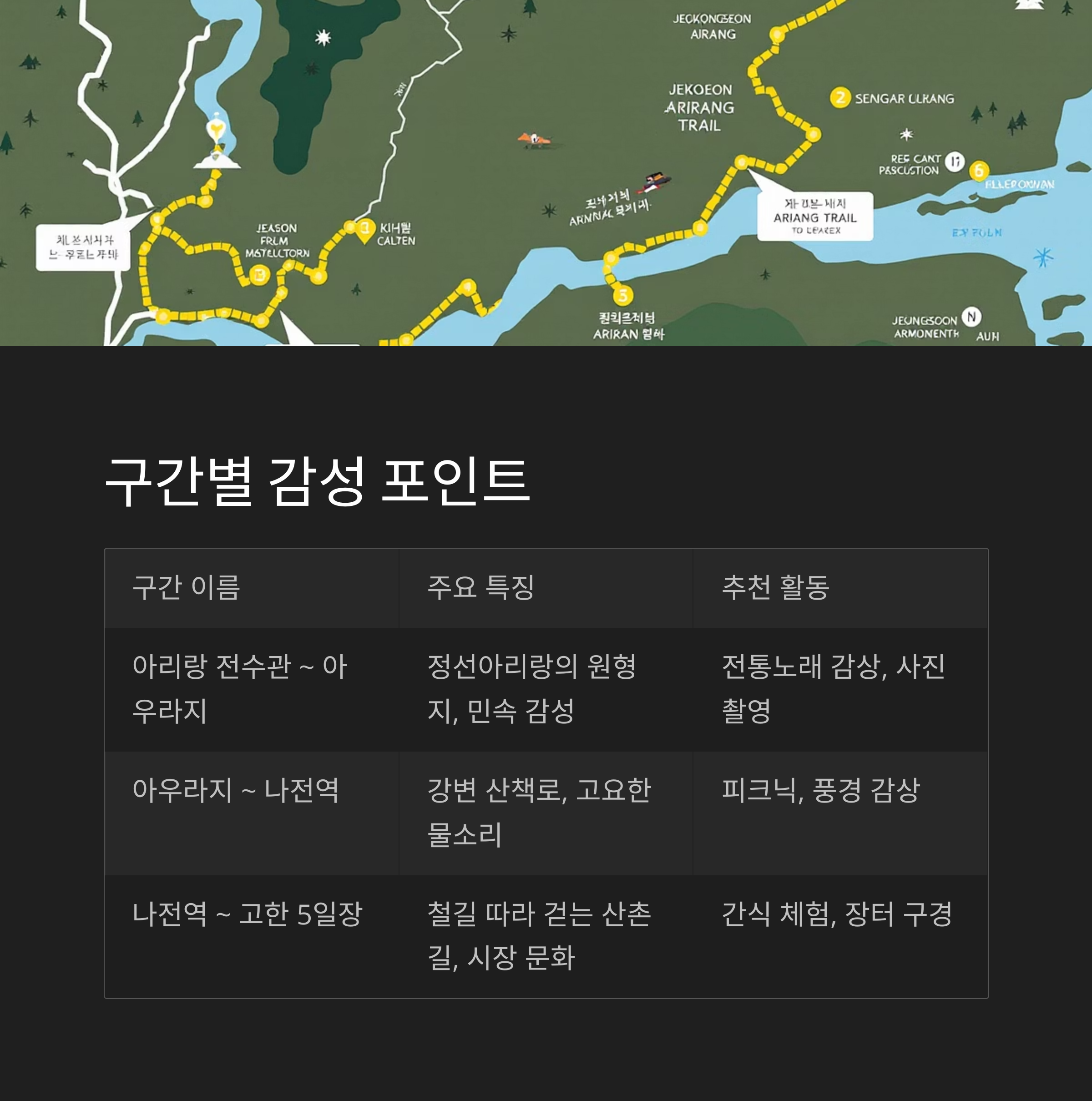 길의 시작은 정선 아리랑의 원형이 깃든 정선읍 아리랑 전수관 부근에서 출발하며,