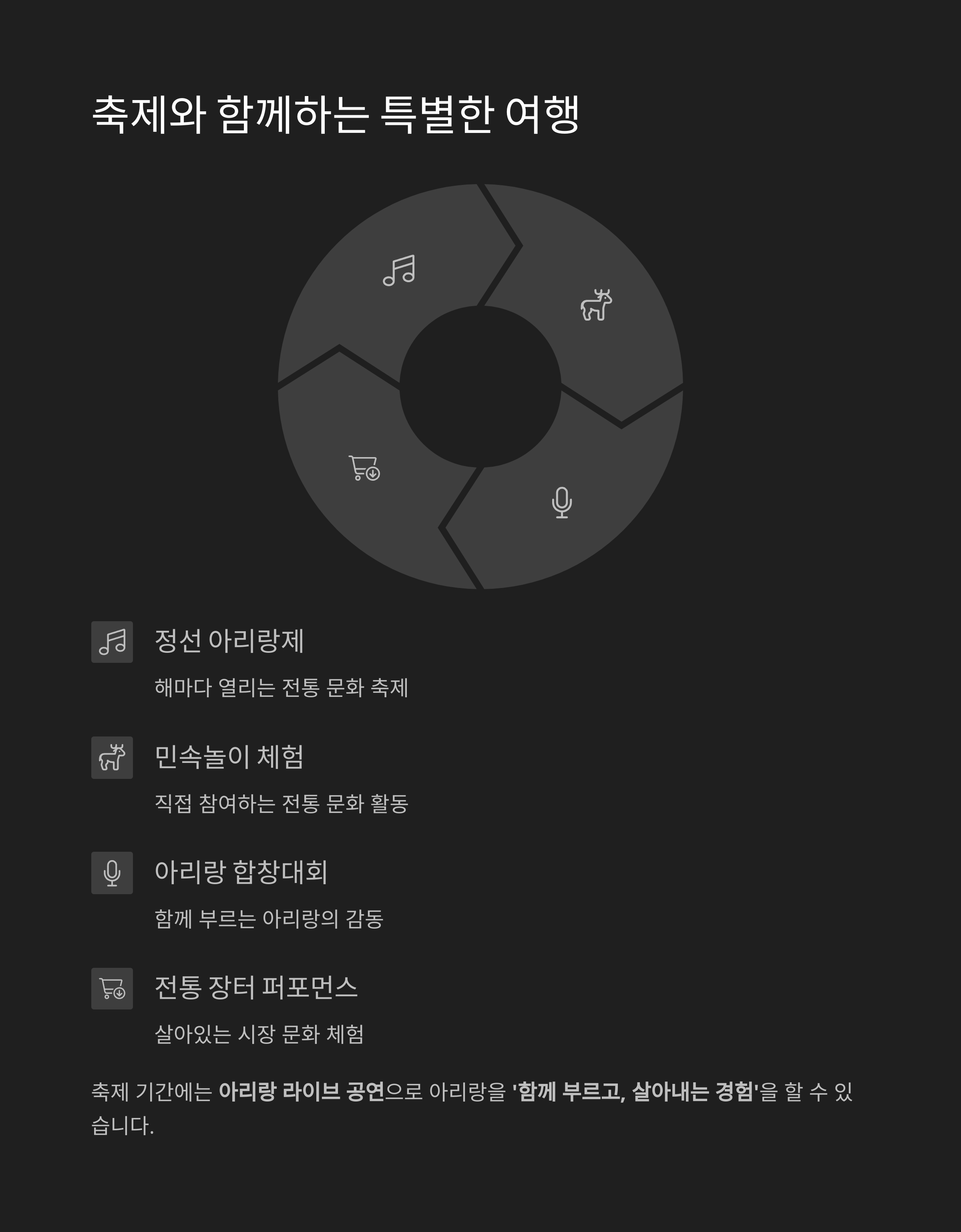 | 고한 장터 | 전통주 판매, 문화공연 안내 | 토속적, 마을 주민 참여형 |