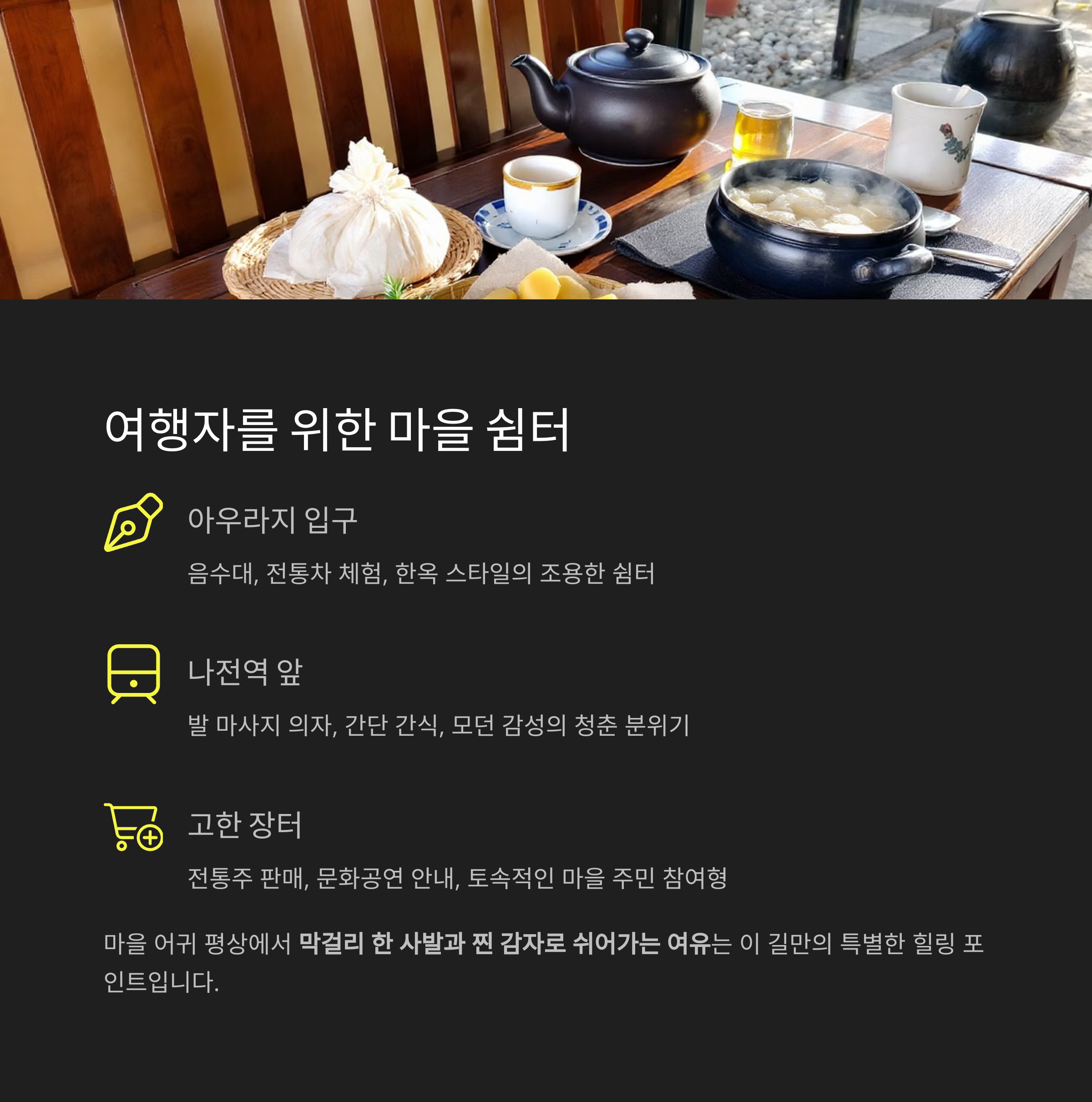 단순한 산책로가 아닌, 문화와 사람, 자연이 하나로 이어지는 느림의 미학을 보여주는 공간입니다.