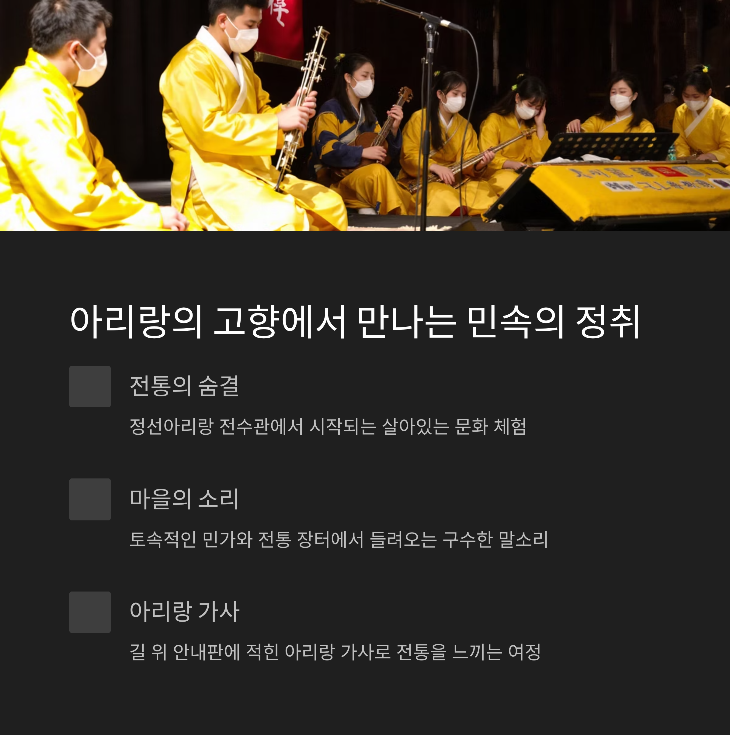 | 아리랑 전수관 ~ 아우라지 | 정선아리랑의 원형지, 민속 감성 | 전통노래 감상, 사진 촬영 |