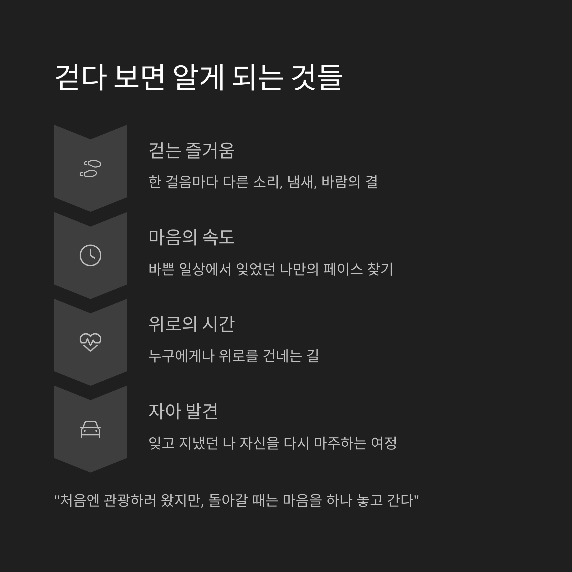 바쁜 일상 속에서 잊었던 ‘걷는 즐거움’과 ‘마음의 속도’를 되찾게 해주는 길입니다.