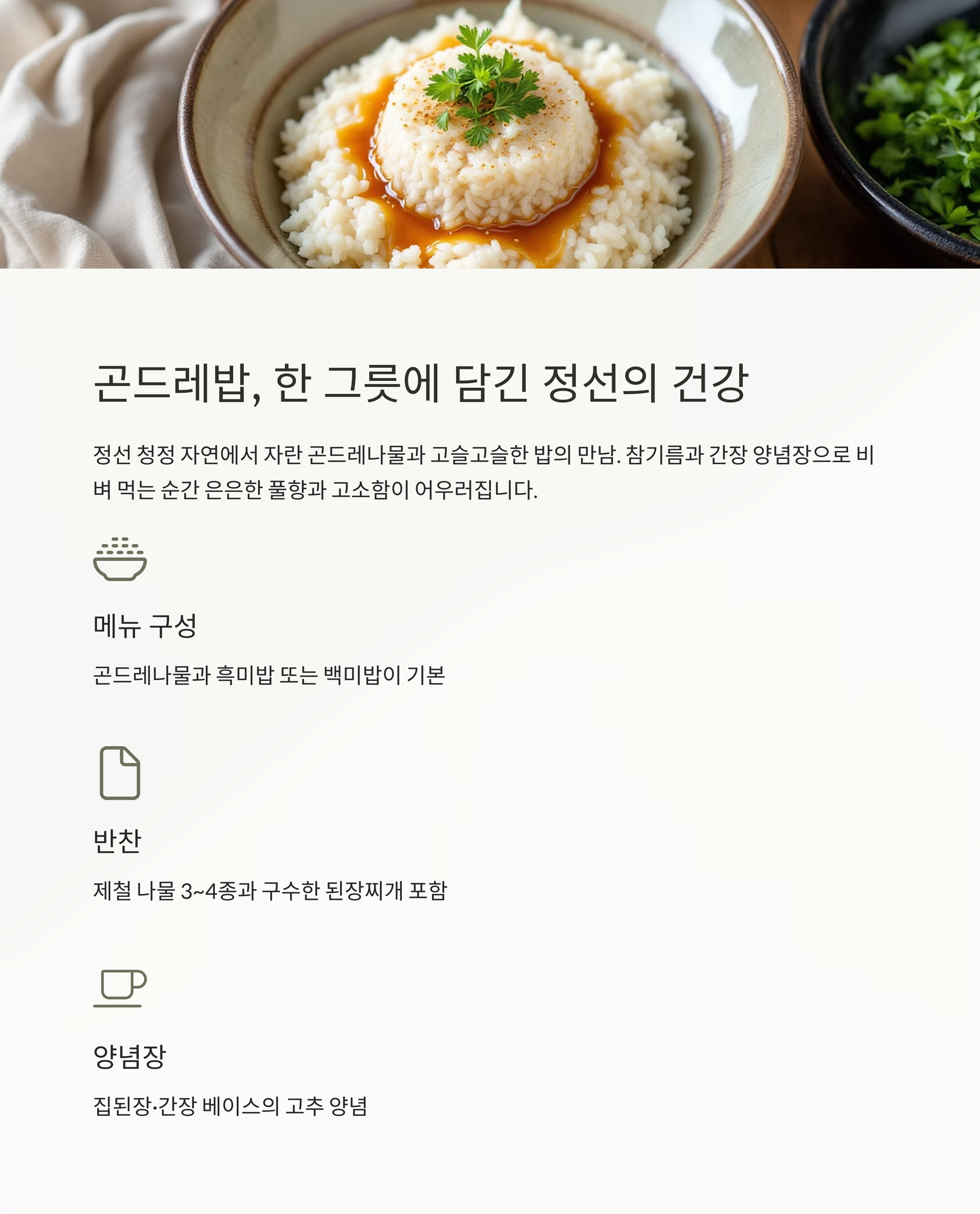 곤드레밥 세트 구성 예시는 다음과 같습니다.