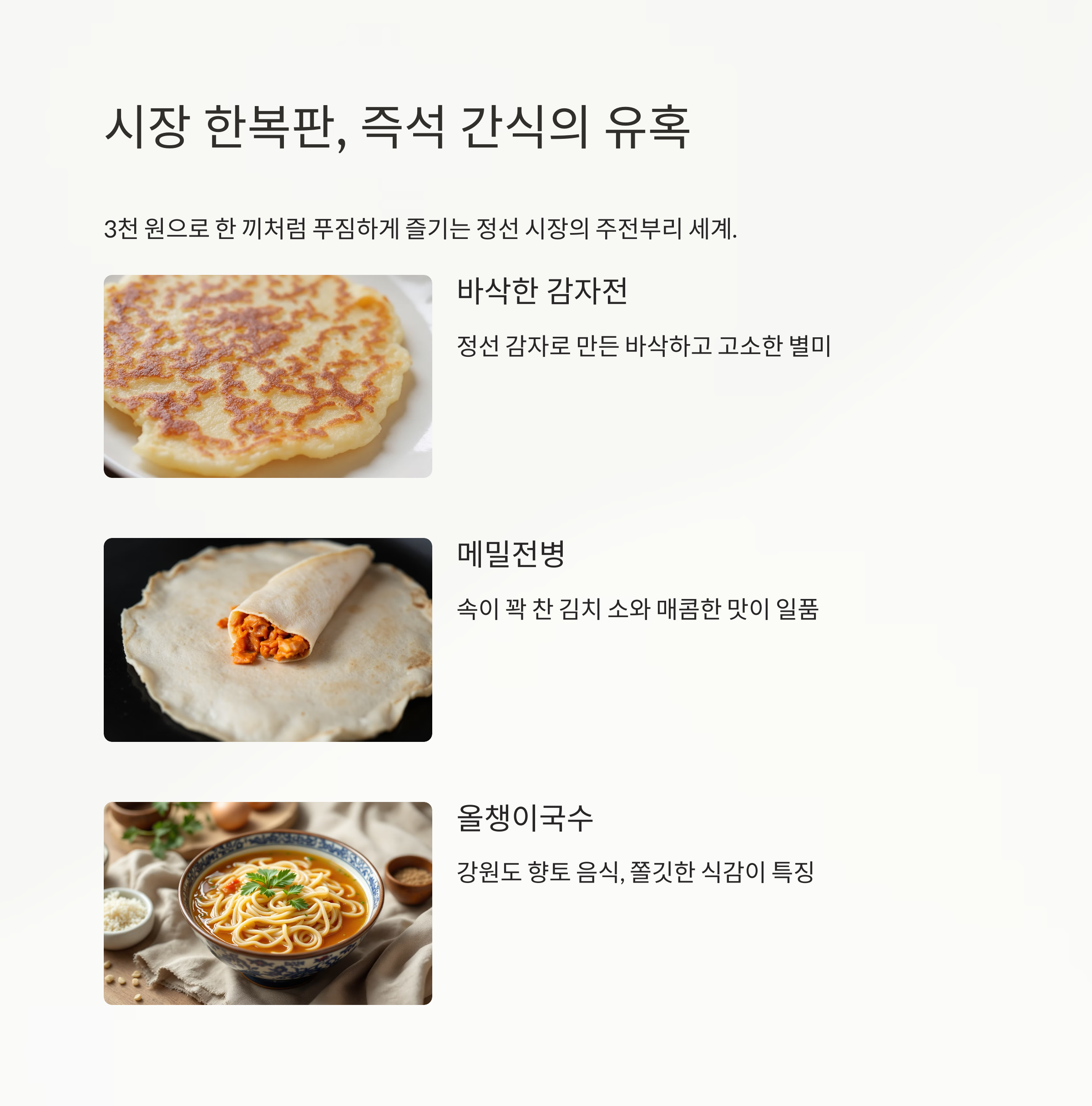 정선 여행 중 필수 코스로 꼽힙니다. 이 글에서는 시장 안팎의 먹거리 명소와