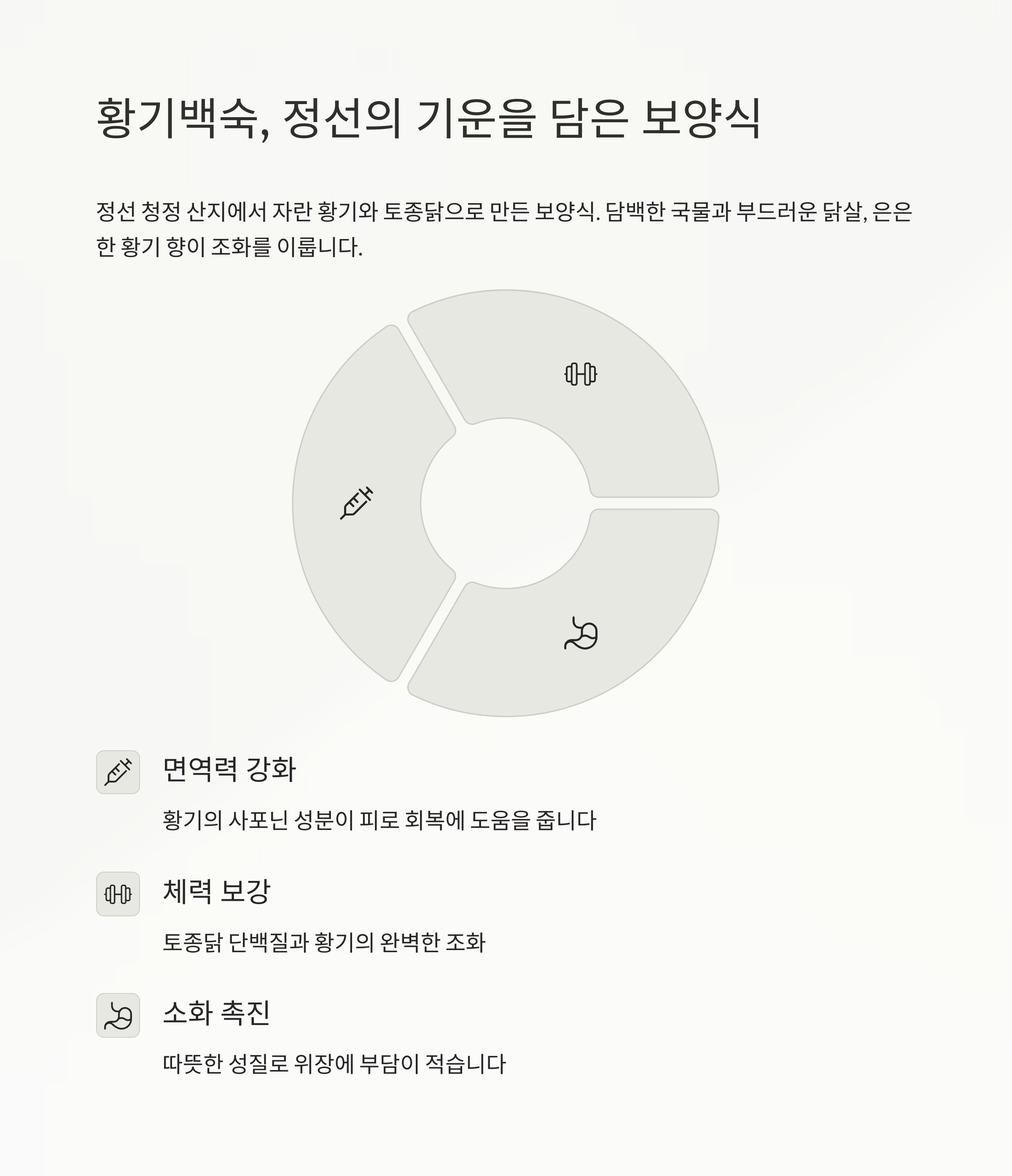 | 체력 보강 | 토종닭 단백질과 황기의 조화 |