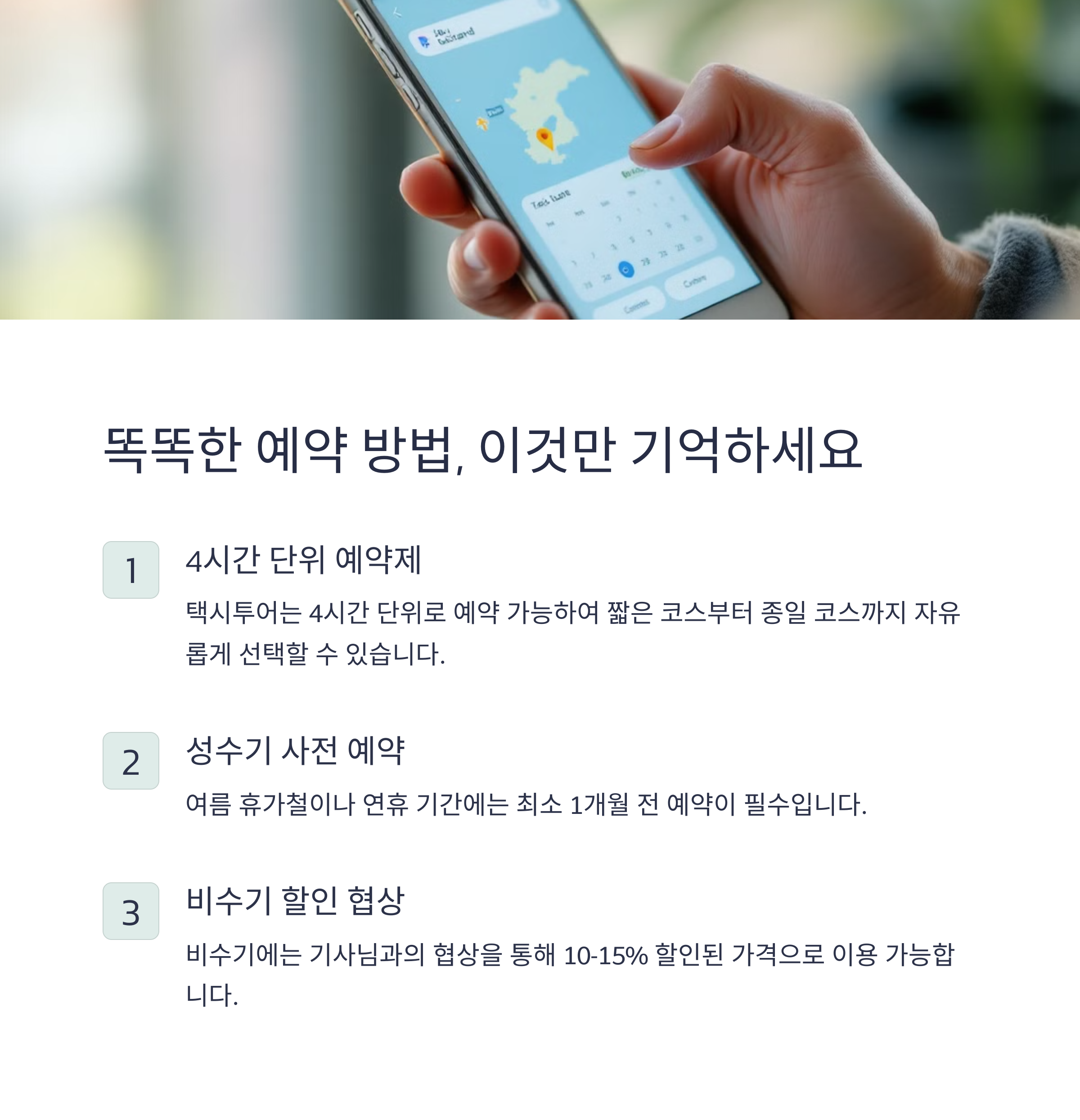 요금 및 예약 팁도 중요한 포인트입니다. 중형 기준 기본요금은 4,100원부터 시작되며, 23시~4시에는 심야 할증이 적용되기 때문에 야간 운행 계획이 있다면 주의가 필요합니다. 예약은 4시간 단위로 가능하며, 성수기에는 최소 1주일 전 예약을 권장합니다. 반대로 비수기에는 기사님과 직접 연락을 통해 할인 협상이 가능한 경우도 있어 유동적인 가격 구조를 이해하고 접근하는 것이 좋습니다.