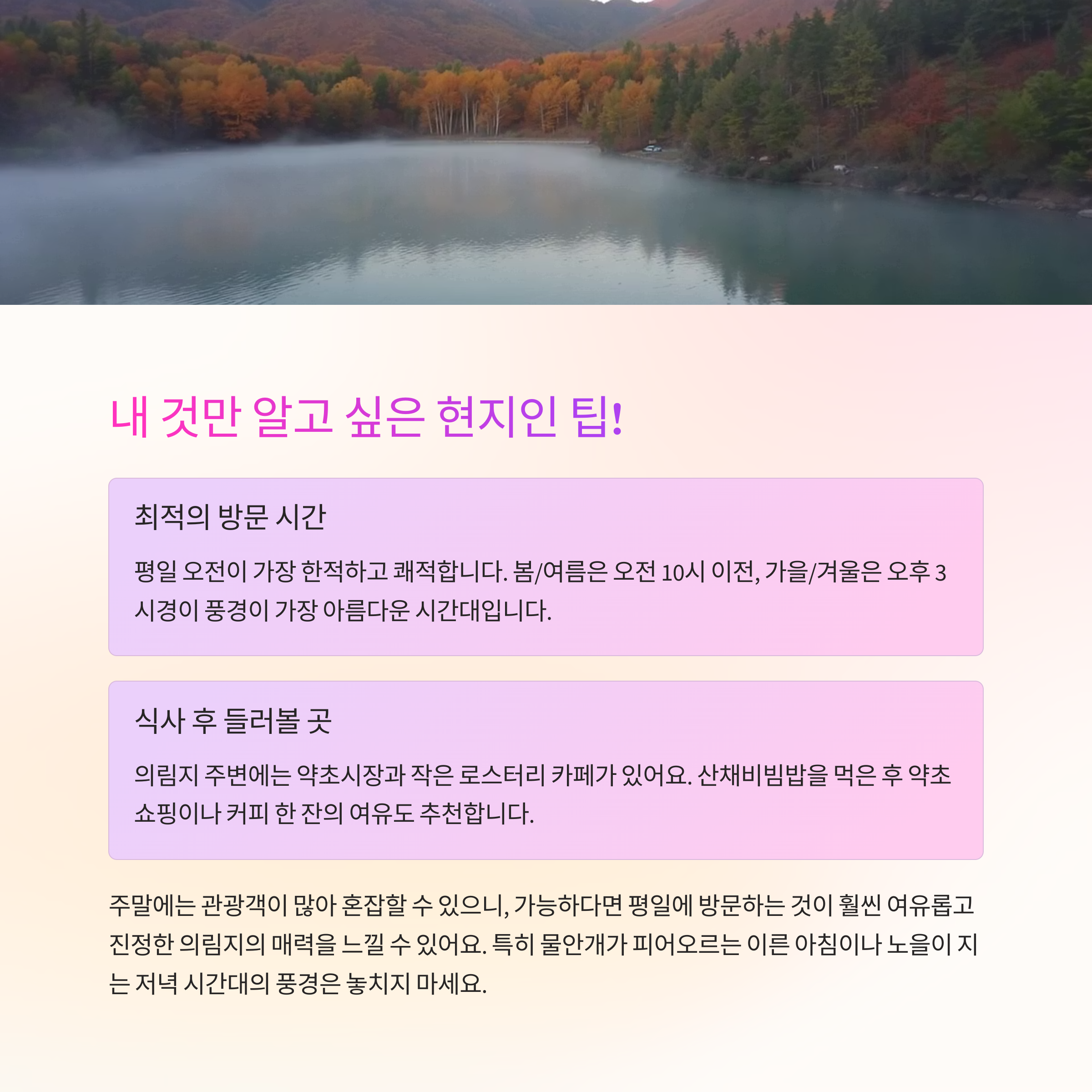 자연을 따라 걷고, 건강한 한 끼로 마무리하고 싶다면 제천 의림지는 최고의 선택입니다. 청풍호와 함께 충북 제천을 대표하는 힐링 명소인 의림지는 사계절 언제나 산책하기 좋고, 산채비빔밥 한 그릇으로 여행의 피로도 싹 풀 수 있습니다. 이 글에서는 도심 속 한적한 걷기 코스부터 제천 사람들이 추천하는 진짜 산채비빔밥 맛집까지, 하루 동안 여유롭게 즐길 수 있는 루트를 소개합니다.