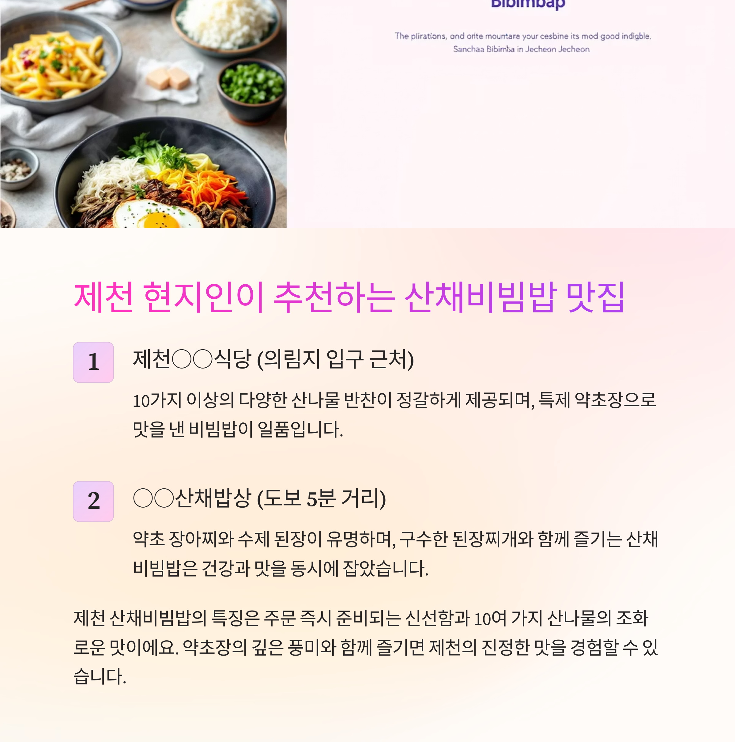 | 제천○○식당 | 의림지 입구 근처 | 10가지 이상 산나물 반찬 제공 |