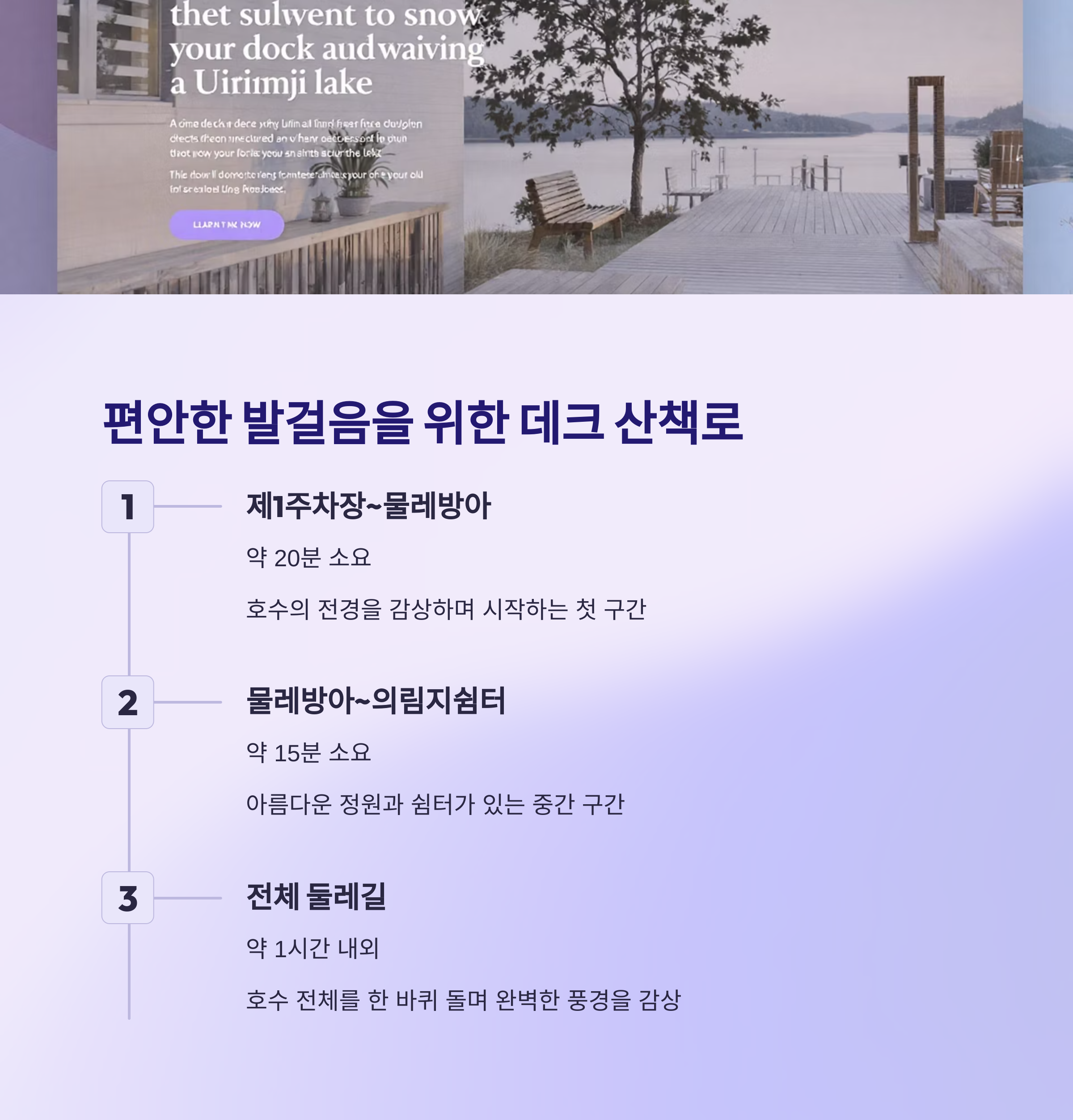 호수를 따라 이어진 나무 데크는 걷는 내내 시야를 탁 트이게 해 주며,