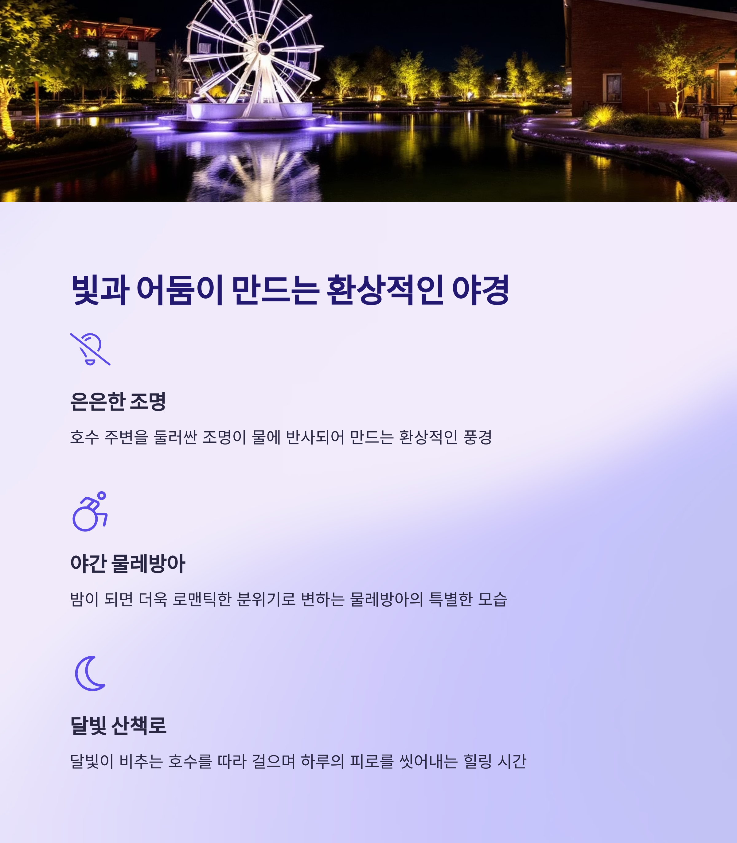 조명이 은은하게 비추는 호수와 물레방아, 조용한 바람 소리는