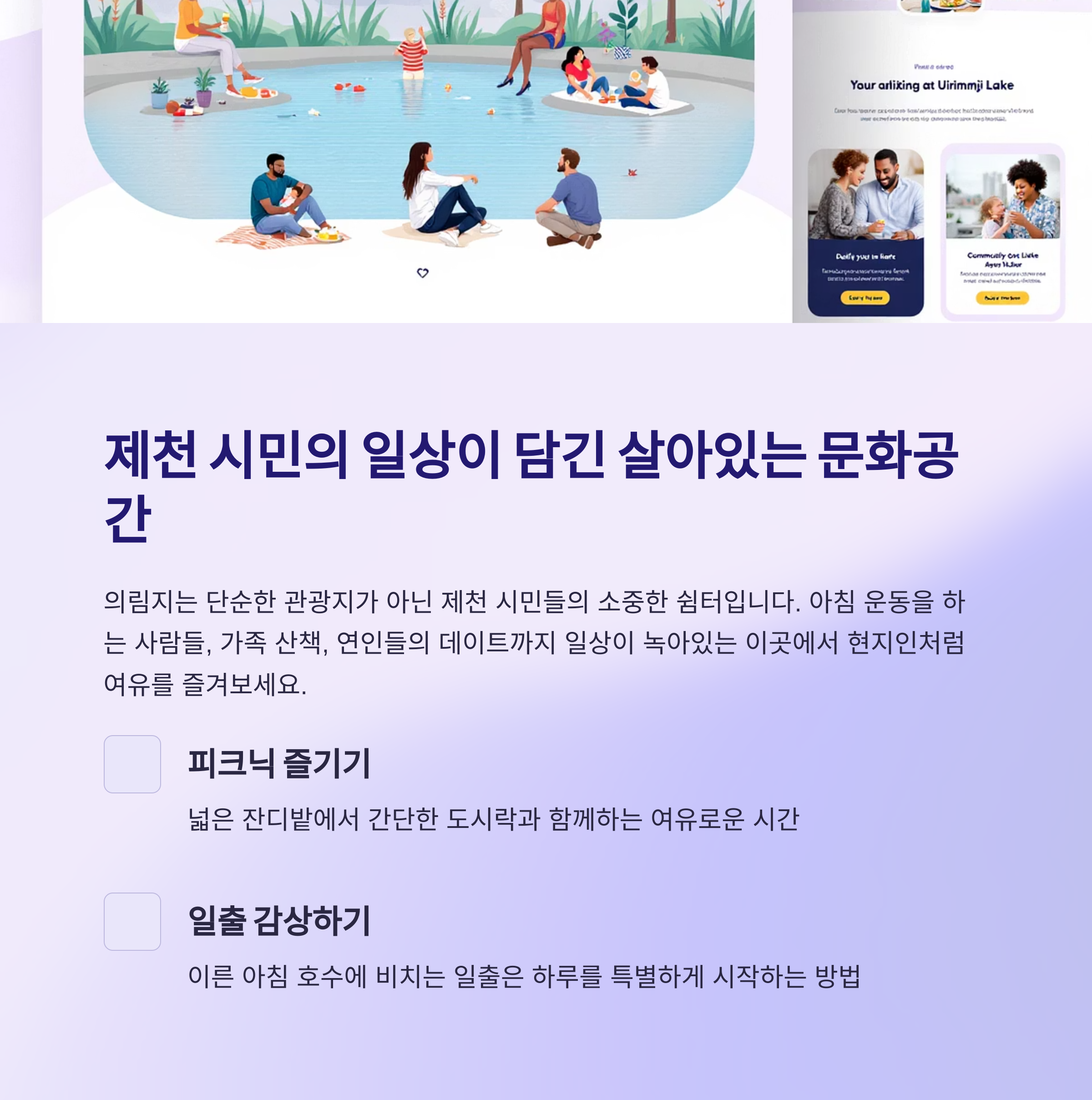 의림지는 단순한 관광지가 아닌, 제천 시민들의 일상 속 쉼터로 사랑받고 있습니다.