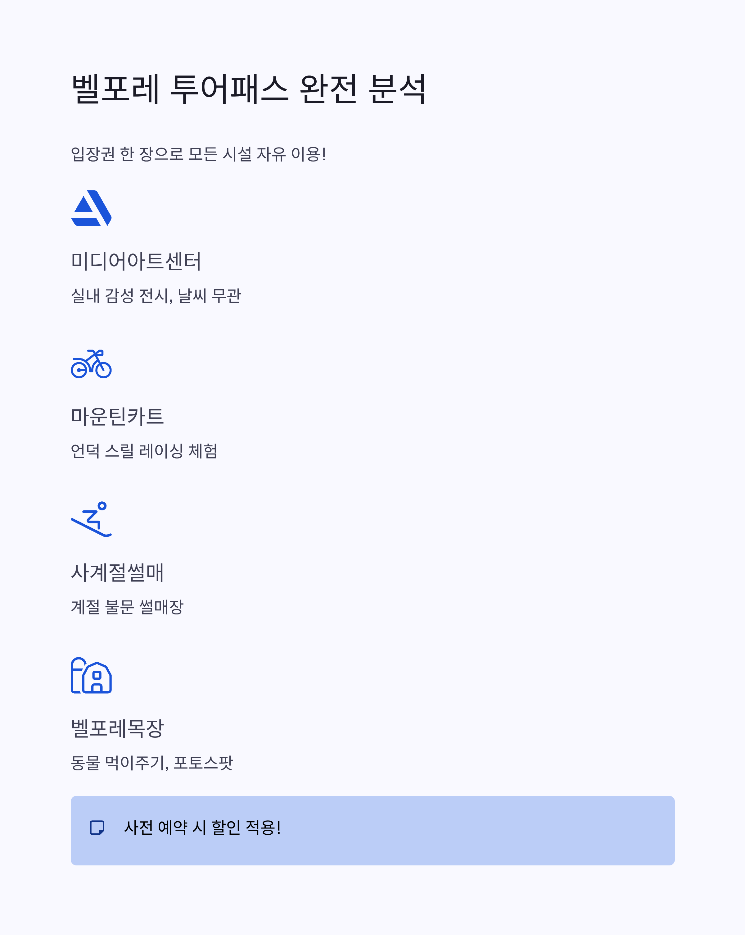 벨포레 투어패스는 입장권 한 장으로 리조트 내 다양한 시설을 자유롭게 이용할 수 있는 종합 이용권이에요.